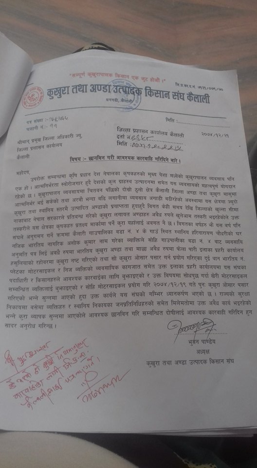 कैलालीको कैलारी गाँउपालिकामा एक भारतीय नागरिकले व्यावसाय दर्ता गरी कुखुरा र माछाको तस्करी गरिरहेको आरोप लागेको छ । भारतको पलियाकलाका अशोक कुमारले कैलारी गाँउपालिकाबाट व्यापार÷व्यावसाय ईजाजत पत्र लिएर वडा नम्बर ४ को हसुलियामा अशोक पोल्ट्री फार्म एण्ड माछा सप्लार्यस नामक फार्म खोली कुखुरा र माछाको कारोबार गर्दै आएका छन् ।