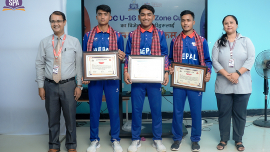 He further highlighted that SPA College currently boasts eight international cricket players among its student body. Notably, Lokesh Bam from the Nepali National Senior Team, Narayan Joshi from the U-19 Team, Basant Karki, Kavita Kunwar from the Senior Women's National Team, Ishwari Bishta, Lakshmi Saud from the U-19 Women's National Team, and Yashoda Bishta, Suman Bishta, Manisha Chaudhary, and Manisha Upadhyay are all players who proudly represent SPA College.