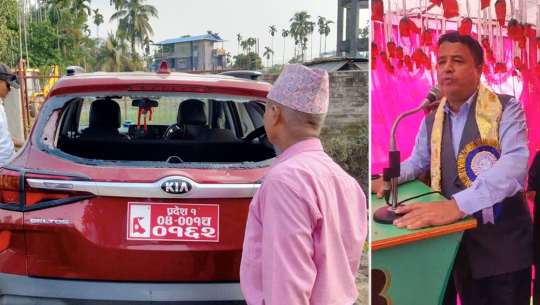 झापामा एमाले नेता महेश बस्नेतको गाडीमा ढुंगामुढा प्रहार