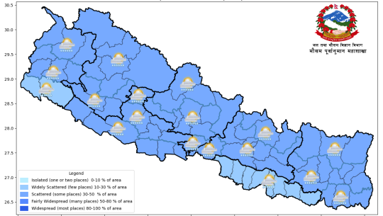 धनगढीः हाल नेपालमा पश्चिमी वायुको आंशिक प्रभाव रहेको छ। मौसम पूर्वानुमान महाशाखाका अनुसार सोमवार देशका पहाडी भू–भागमा आंशिकदेखि साधरणतया बदली रही बाँकी भू–भागमा आंशिक बदलीदेखि मौसम मुख्यतया सफा रहनेछ। देशको उच्च पहाडी तथा हिमाली भू–भागका थोरै स्थानहरूमा हल्का हिमपातको सम्भावना रहेको छ।