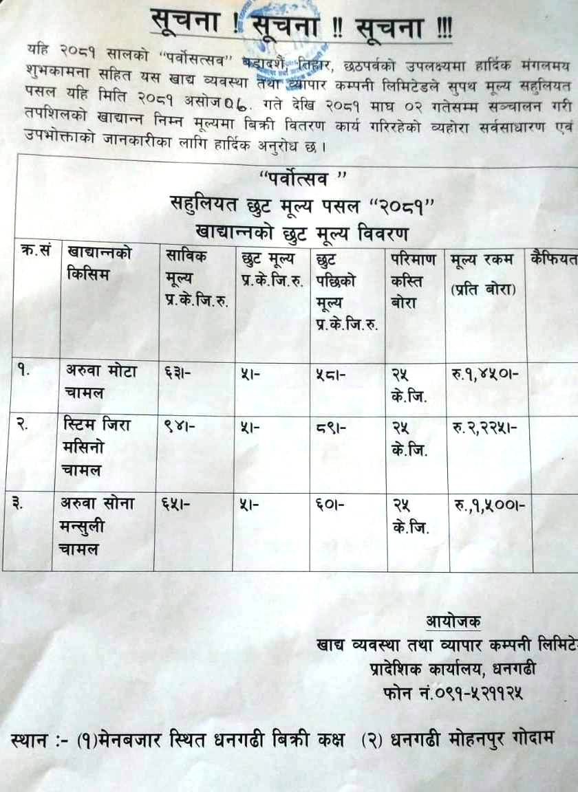 खाद्यले दशैँ, तिहार र छठको उपलक्षमा सहुलियत मूल्य पसलहरू सञ्चालन गरेको छ। खाद्य व्यवस्था तथा व्यापार कम्पनी लिमिटेड, सुदूरपश्चिम प्रादेशिक कार्यालयले दुई स्थानमा सहुलियत मूल्य पसल सञ्चालन गरेको हो। कम्पनीले २०८१ असोज ७ गतेदेखि माघ २ गतेसम्म सहुलियत मूल्य पसल सञ्चालन गर्ने भएको छ। कम्पनीले अरुवा मोटा चामलको मूल्य प्रति किलोग्राममा पाँच रुपैयाँ छुट गरेर ५८ रुपैयाँ निर्धारण गरेको छ। २५ किलोग्राम अरुवा मोटा चामलको एक हजार चार सय ५० रुपैयाँ मूल्य निर्धारण गरिएको हो।