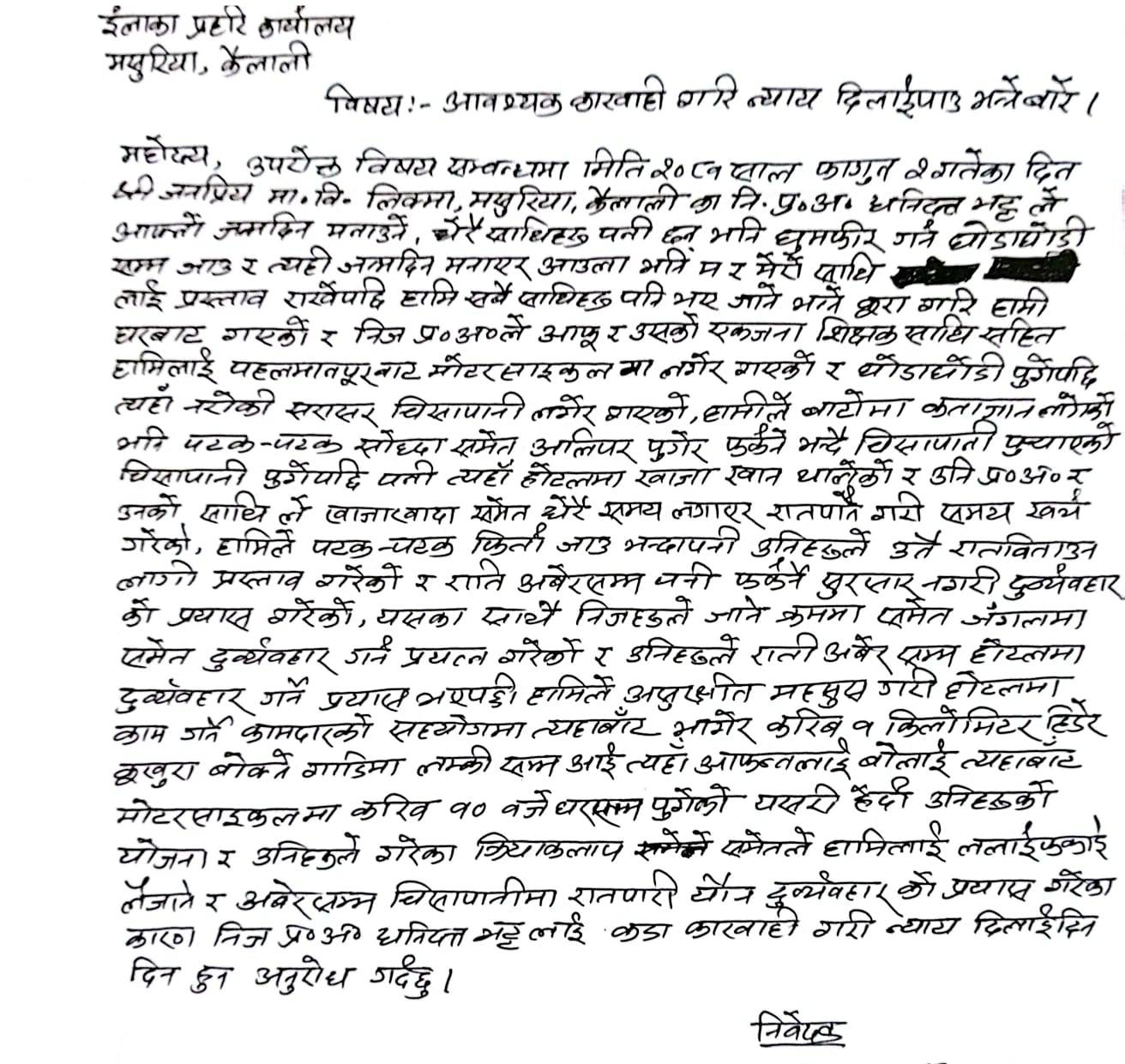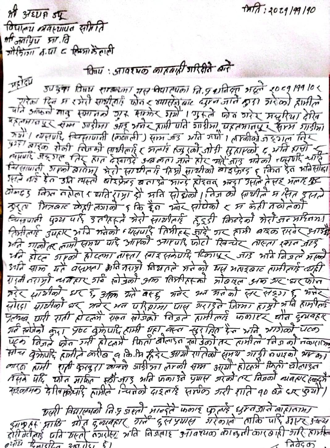 जिल्लाको गौरीगंगा नगरपालिका–८ लिक्माको जनप्रिय माध्यमिक विद्यालयका निमित्त प्रधानाध्यापक भट्टले जन्म दिन मनाउने योजना बनाए। उनले चौधरी थरकी एक छात्रालाई घोडाघोडी तालमा आफ्नो जन्म दिन मनाउने योजना सुनाए। उनलाई फोन गरे। म्यासेन्जरमा पनि आफूसँग घोडाघोडी जान प्रस्ताव गरे।