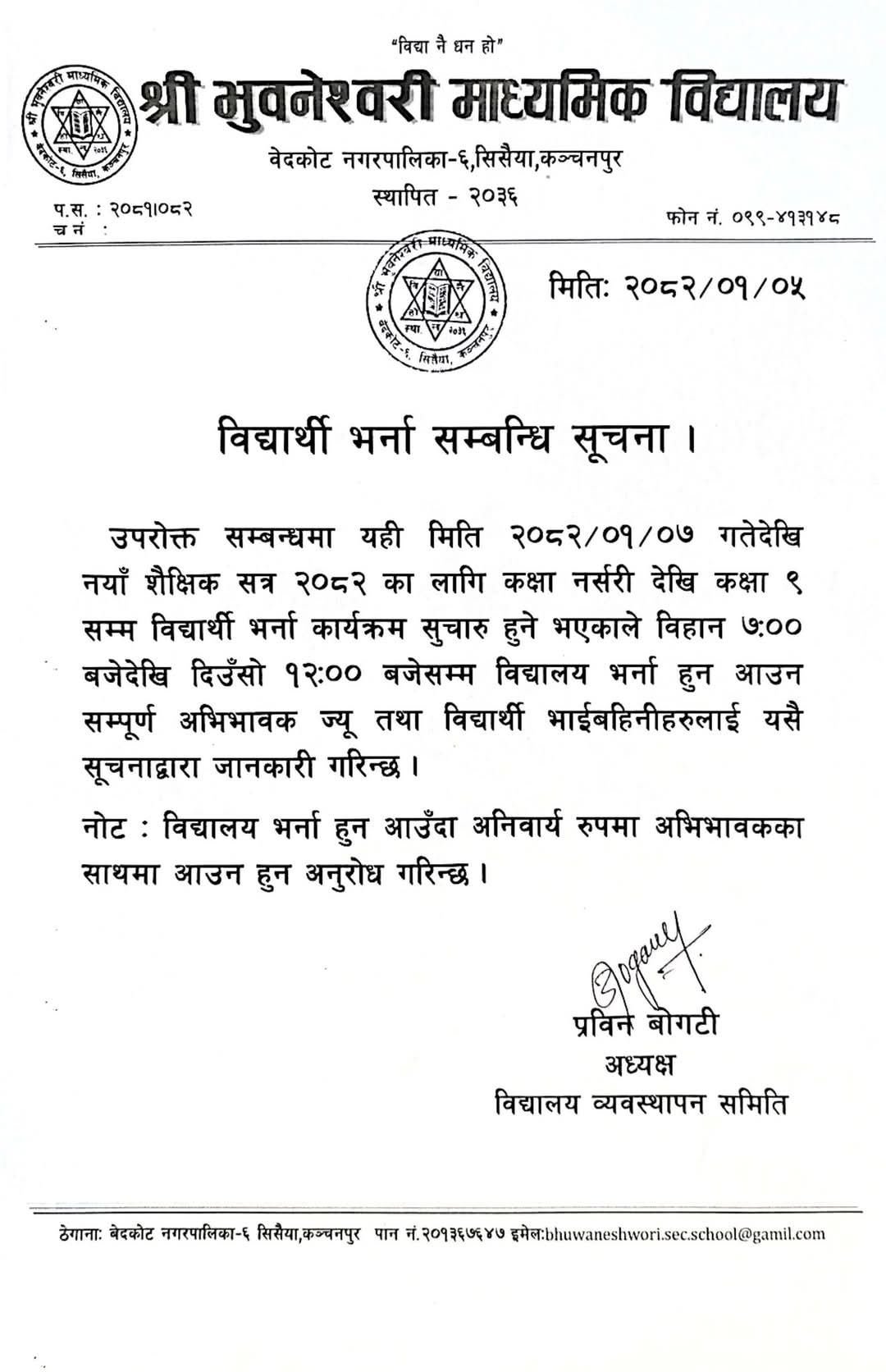 Prabin Bogati, Chairperson of the School Management Committee, issued a notice announcing that the enrollment drive will commence from Baisakh 7. He urged parents to accompany their children when coming to school for admission and called on both students and guardians not to be discouraged by the ongoing protest.
