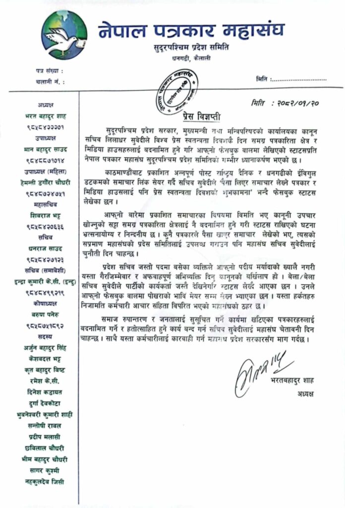 Dhangadhi: The Federation of Nepali Journalists (FNJ), Sudurpaschim Province Committee, has strongly objected to a recent social media post made by Liladhar Subedi, Law Secretary of the Office of the Chief Minister and Council of Ministers under the Far West Province Government, calling it an attack on press freedom.