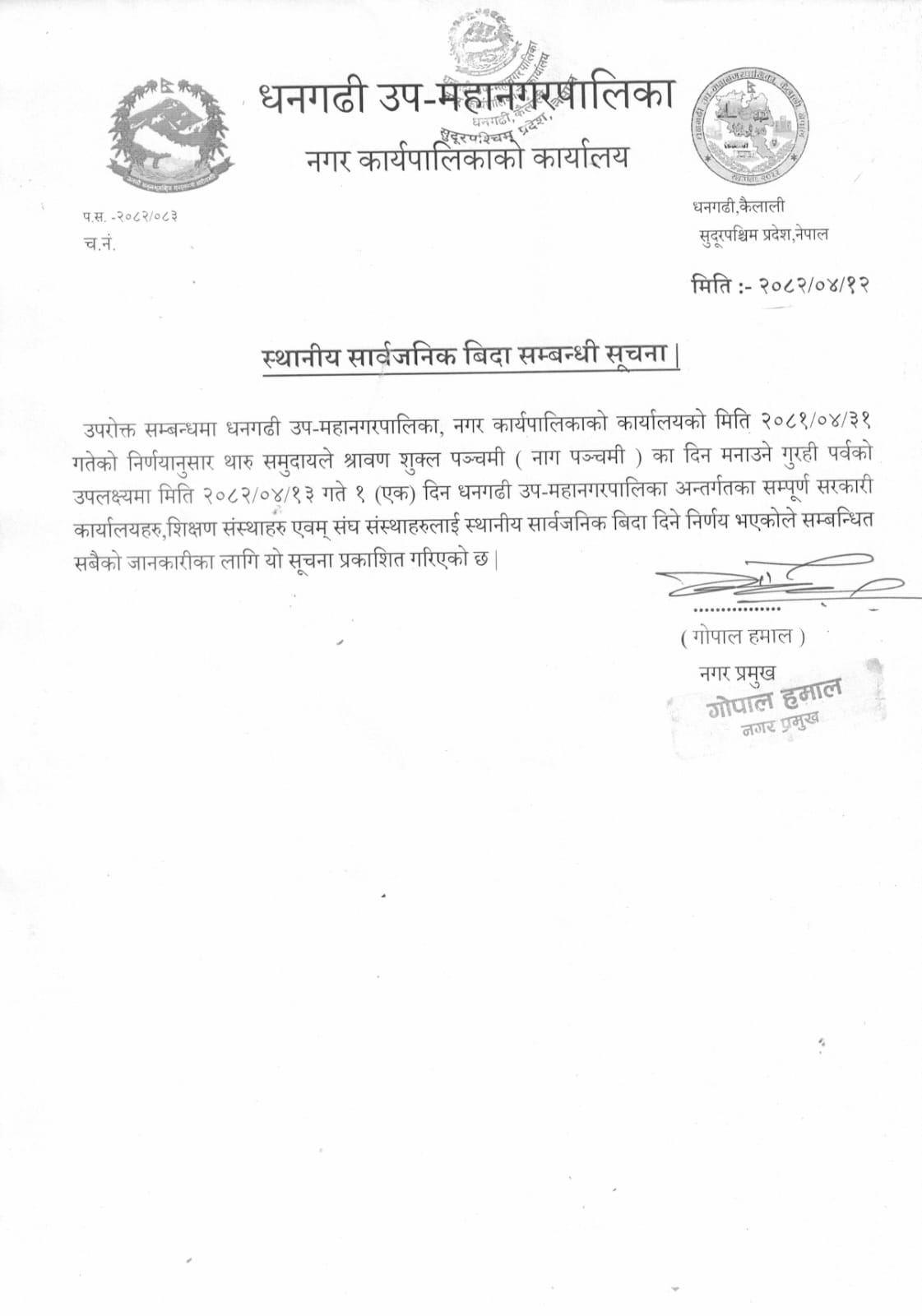 Dhangadhi: Dhangadhi Sub-Metropolitan City has declared a public holiday for tomorrow, Shrawan 13, to mark the Gurahi festival celebrated by the Tharu community.