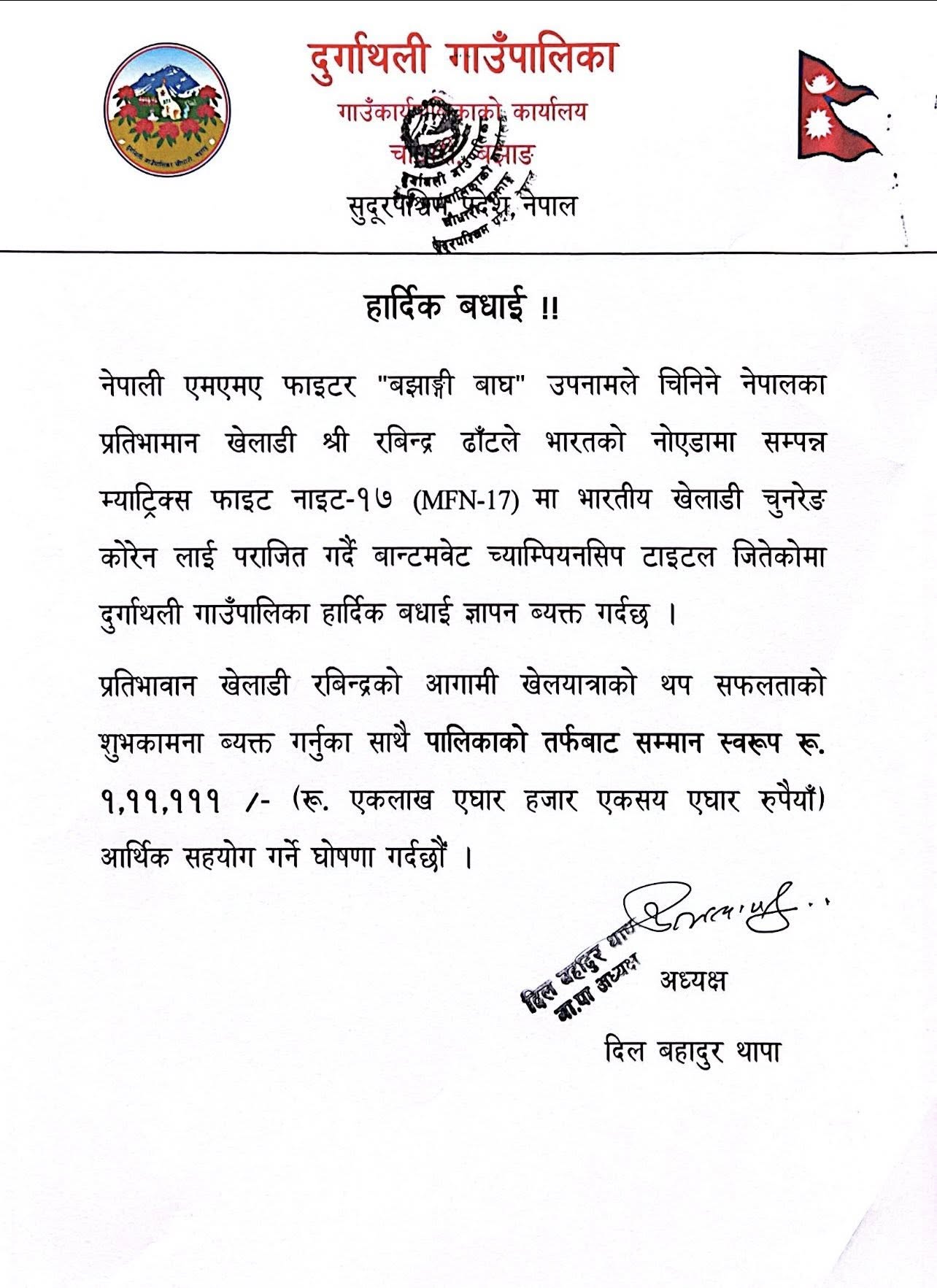 पहिलो पटक म्याट्रिक्स फाइट नाइट (एमएफएन)को उपाधि जितेका रविन्द्रलाई गाउँपालिकाले सम्मान स्वरुप एक लाख ११ हजार एक सय ११ रुपैयाँ सहयोग घोषणा गरेको हो।