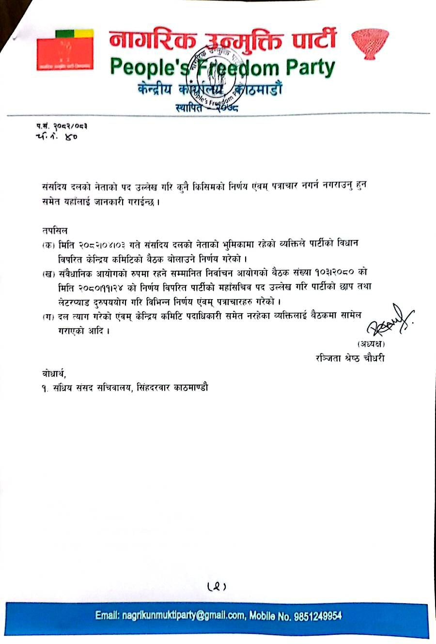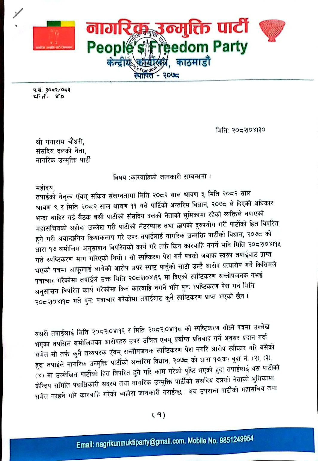 पार्टीको संसदीय दलको नेताको भूमिकामा रहेको व्यक्तिले नपाएको महासचिवको ओहोदा उल्लेख गरी पार्टीको लेटरप्याड तथा छापको दुरुपयोग गरी पार्टीको हित विपरीत हुने गरी अवाञ्छनीय क्रियाकलाप गरेको भन्दै स्पष्टीकरण सोध्दा पनि चित्तबुझ्दो नदिएपछि फेरि माग्दा जवाफ नै नदिएको पत्रमा उल्लेख छ।