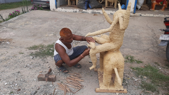 मूर्ति निर्माणका लागि माटो, पराल, सुतली धागो, काठ, किला, कपास, बोरालगायत सामग्री प्रयोग हुने शाहले बताए। लामो समयदेखि यही पेसाबाट छोराछोरीको शिक्षादिक्षासँगै आठ जनाको परिवारको जीविकोपार्जन भइरहेका उनले बताए।