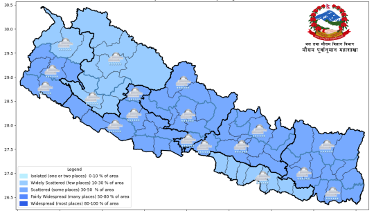 लुम्बिनी प्रदेशलगायत पहाडी भूभाग र तराईका केही स्थानमा मध्यम वर्षाको सम्भावना छ। त्यसैगरी, आज राति कोशी र मधेस प्रदेशलगायत देशका पहाडी भागमा साधारणतया बदली रही बाँकी भागमा आंशिक बदली रहने हुनेछ। कोशी, मधेस, वाग्मती र गण्डकी प्रदेशका केही तथा अन्य प्रदेशका पहाडी भागका केही स्थानमा मध्यम वर्षाको सम्भावना छ।