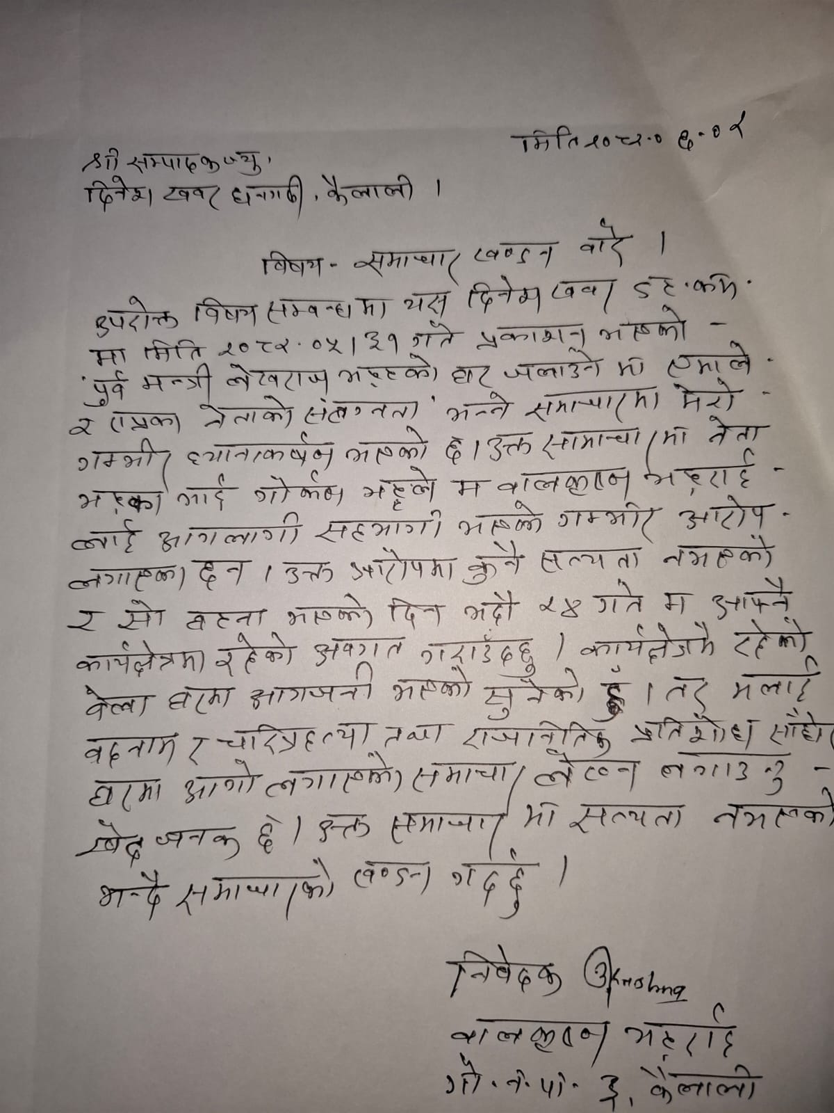 धनगढीः नेकपा एमाले जिल्ला लेखा समितिका सदस्य बालकृष्ण भट्टराईले पूर्व मन्त्री लेखराज भट्टको घरमा भएको आगजनीमा आफ्नो संलग्नता नभएको बताएका छन्।