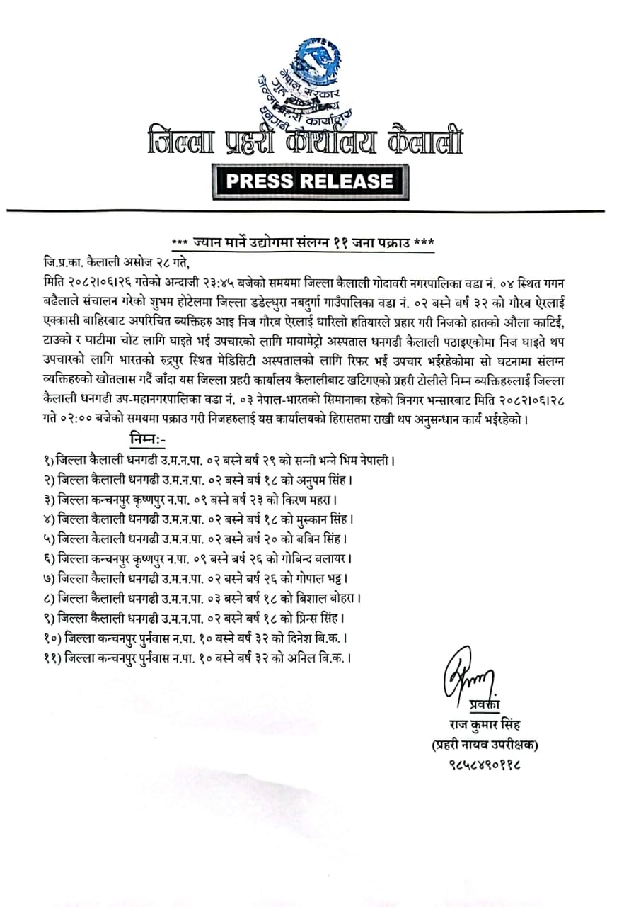 धनगढी: कैलालीको गोदावरीमा ज्यान मार्ने उद्योगमा संलग्न भएको आरोपमा प्रहरीले ११ जनालाई पक्राउ गरेको छ। असोज २६ गते गोदावरी-४ को एक होटेलमा खाना खाइरहेका डडेल्धुराको नवदुर्गा-२ का २१ वर्षीय गौरव ऐरलाई धारिलो हतियार प्रहार गरेका उनीहरूलाई प्रहरीले मङ्गलवार धनगढीबाट पक्राउ गरेको हो।