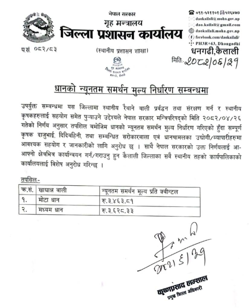 जिल्ला प्रशासन कार्यालय कैलालीले असोज ३१ गते सार्वजनिक सूचना निकालेर सरकारले तोकेको समर्थन मूल्यमा धान खरिद बिक्री गर्न आग्रह गरेको छ। जिल्ला प्रशासन कार्यालयले सरकारले निर्धारण गरेको न्यूनतम मूल्यमा धान खरिदबिक्री गर्न किसान तथा उद्योगीहरूलाई आग्रह गरिएको छ। यस्तै सरकारले गरेको निर्णय कार्यान्वयन गर्न स्थानीय प्रशासनलाई अनुरोध गरिएको छ। यो वर्ष सरकारले २०८२ साउन २६ गते धानको न्यूनतम समर्थन मूल्य तोकेको हो। तर कैलालीका किसानले भने सरकारले तोकेको मूल्यमा धान बिक्री गर्न पाएका छैनन्। धान खरिद गर्ने उद्योगी/ व्यापारीबाट किसानले सरकारले तोकेको मूल्य नपाएका हुन्।
