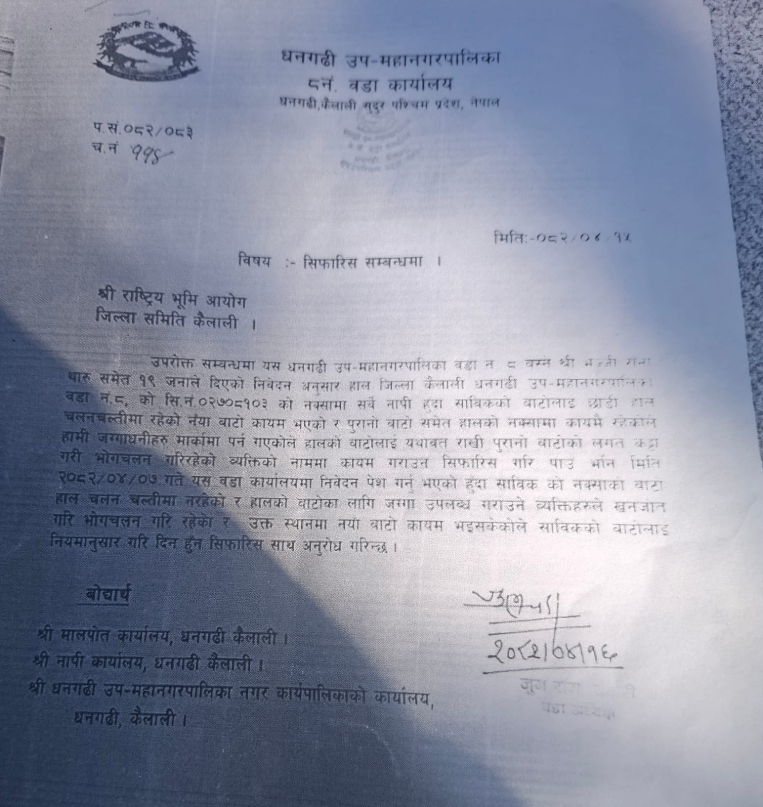 धनगढीः धनगढी उपमहानगरपालिका वडा नम्बर ८ का अध्यक्षले सार्वजनिक सडक व्यक्तिका नाममा दर्ता गर्न राष्ट्रिय भूमि आयोगलाई सिफारिस गरेको तथ्य फेला परेको छ।