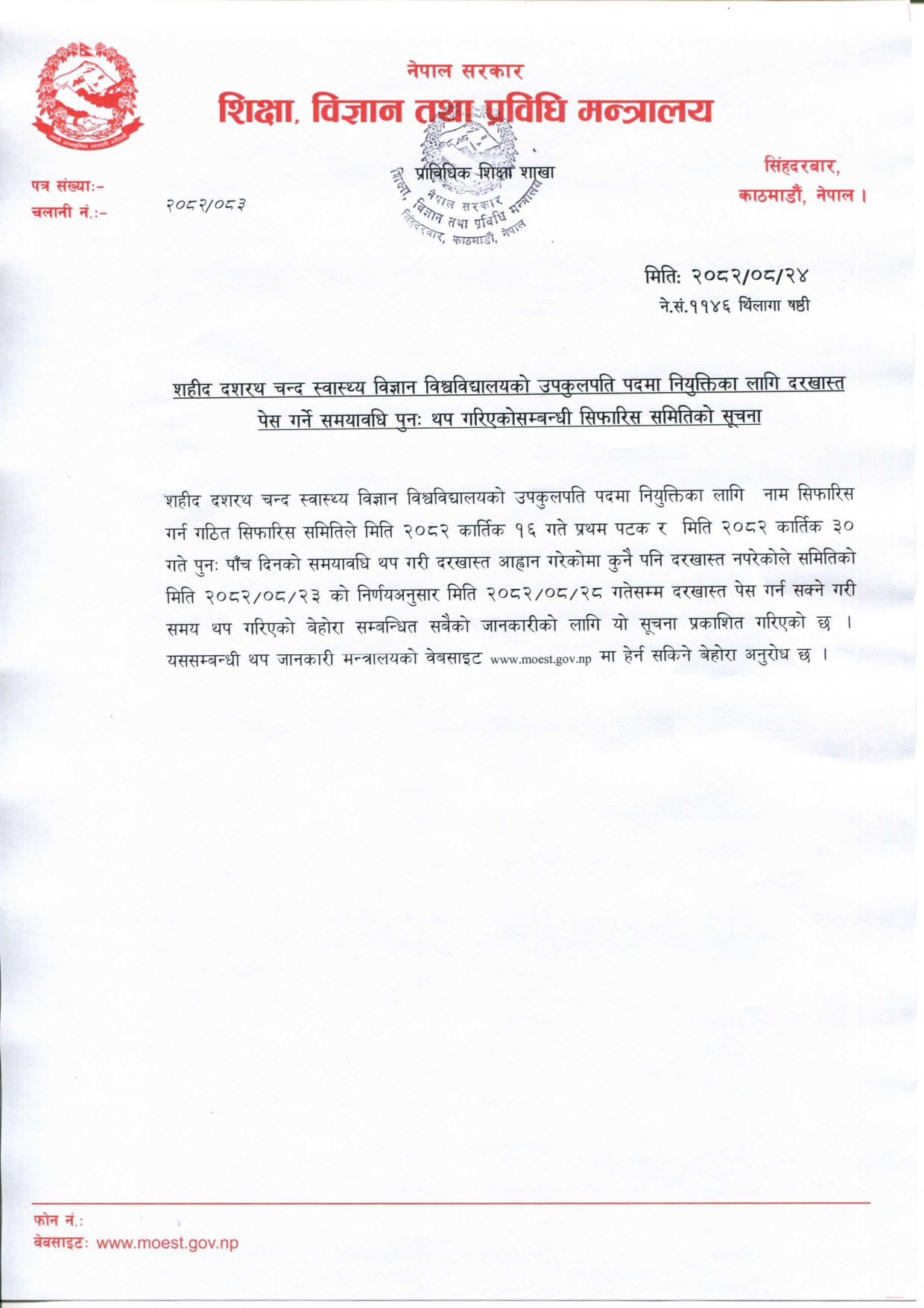 मन्त्रालयले उपकुलपति नियुक्तिका लागि पहिलो पटक कात्तिक १६ गते १५ दिनको म्याद तोकेर दरखास्त आह्वान गरेको थियो । उक्त अवधिमा कसैले पनि आवेदन नदिएपछि पाँच दिनको म्याद तोकेर दोस्रो पटक आवेदन आह्वान गरेको थियो । दोस्रो दिनको म्याद मङ्सिर ५ गते (शुक्रबार) सकिएको थियो ।