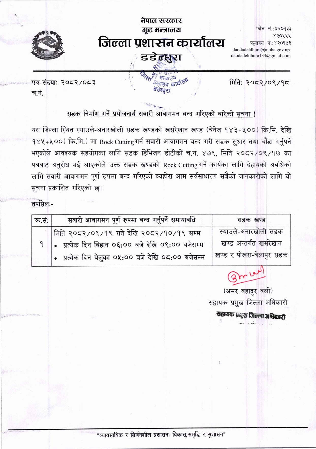 डडेल्धुराको स्याउले- अनारखोली सडक खण्ड एक महिनासम्म दैनिक ६ घण्टा बन्द हुने