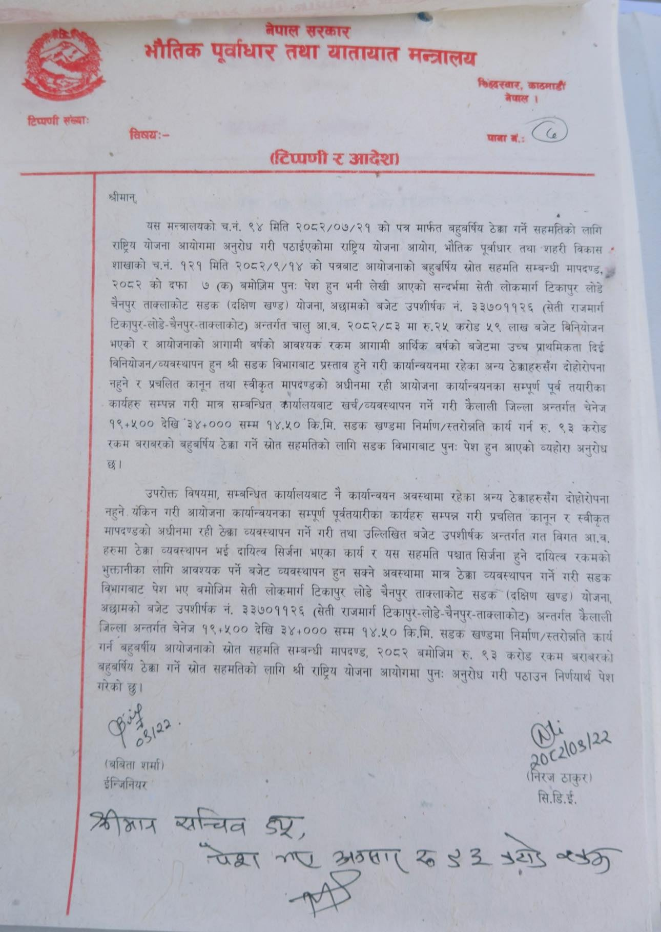 भौतिक पूर्वाधार तथा यातायात मन्त्रालयले सेती लोकमार्गको दक्षिणी सडकखण्ड निर्माण तथा स्तरोन्नतिका लागि ९३ करोड बराबरको बहुवर्षीय ठेक्का गर्ने स्रोत सहमतिका लागि राष्ट्रिय योजना आयोगमा पेश गरेको हो।