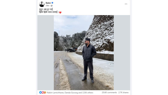 हिउँ जमेको सडकको तस्बिर शेयर गर्दै उनले फेसबुकमा लेखेका छन्, ‘सुदुर अब दुर नाई, झिकै झिकै माया तम्लाई। ❤️’ उक्त अभिव्यक्तिलाई सुदूरपश्चिमप्रति उनको भावनात्मक सन्देशका रूपमा लिइएको छ।