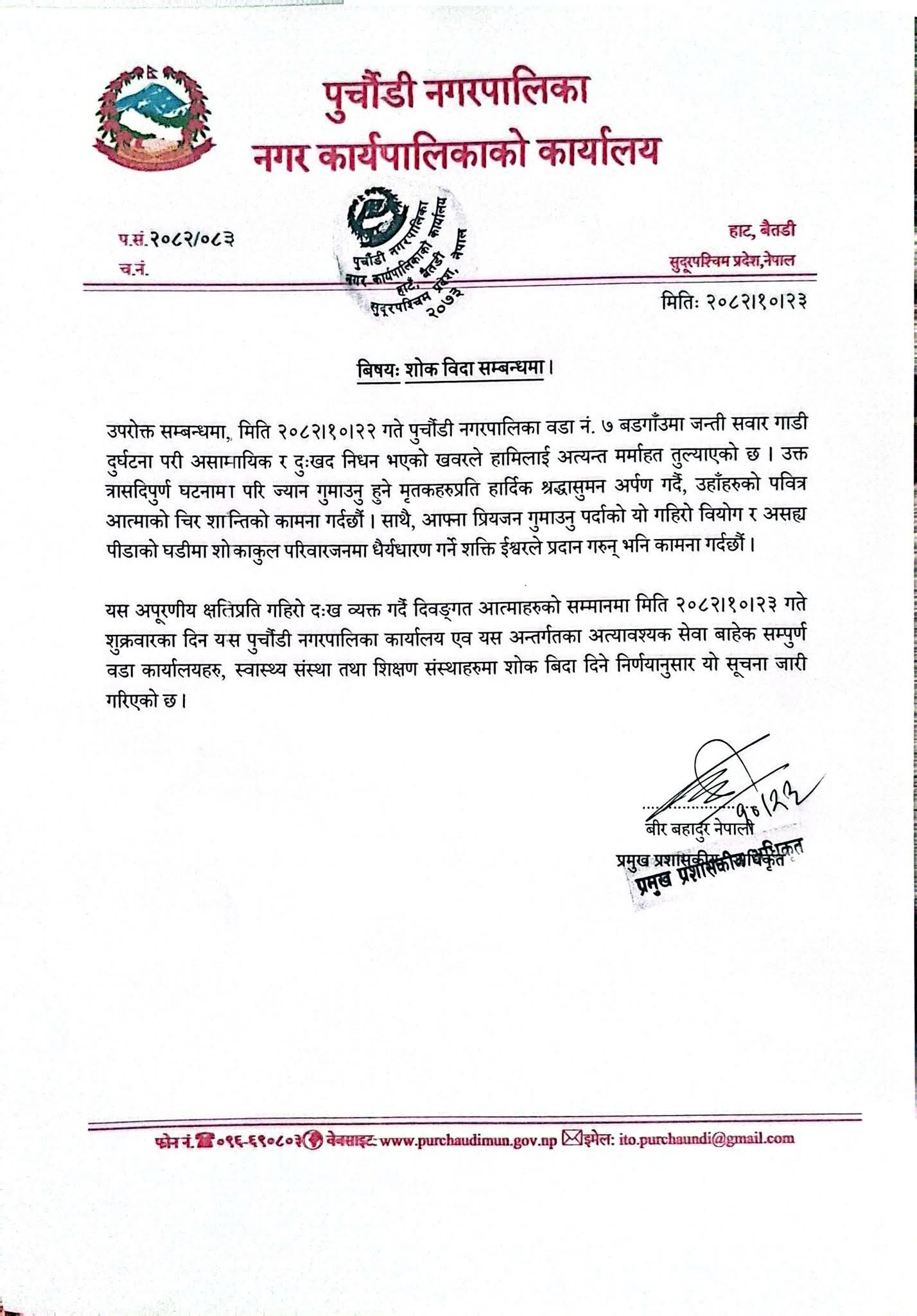 पुर्चौडी नगरपालिका–७ स्थित वडूगाउँ मोडमा जन्ती बोकेको बस बिहीवार दुर्घटना हुँदा १३ जनाको भएकाले शुक्रवार शोक बिदा दिइएको हो। नगरपालिकाले सूचना जारी गर्दै शुक्रवार शोक विदा दिएको बताएको छ। आज नगरपालिका मातहतका सबै कार्यालयहरूमा शोक बिदा रहेको नगरपालिकाको सूचनामा उल्लेख छ।