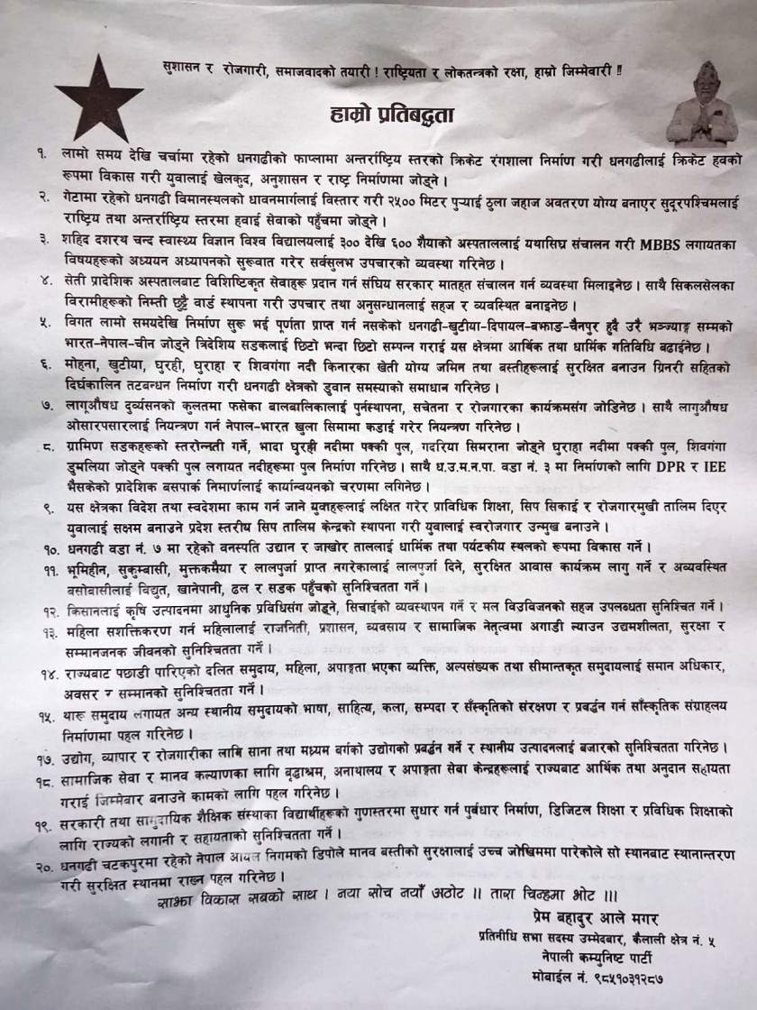 धनगढीः कैलाली-५ मा उम्मेदवार रहेका प्रेमबहादुर आलेले धनगढीको समग्र विकासका लागि महत्वाकांक्षी योजनासहित २० बुँदे प्रतिबद्धता सार्वजनिक गरेका छन्। नेपाली कम्युनिष्ट पार्टी (नेकपा)का तर्फबाट उम्मेदवार बनेका आलेले शनिबार धनगढीस्थित पार्टी कार्यालयमा आफ्नो योजना सार्वजनिक गरेका हुन्।