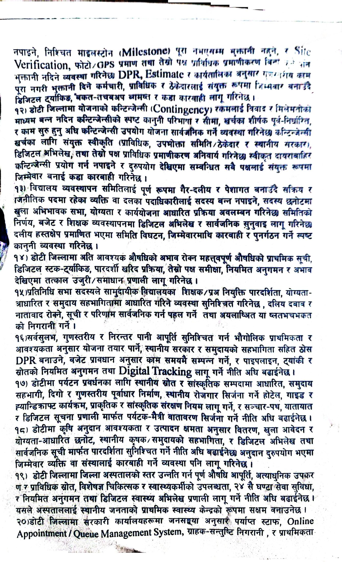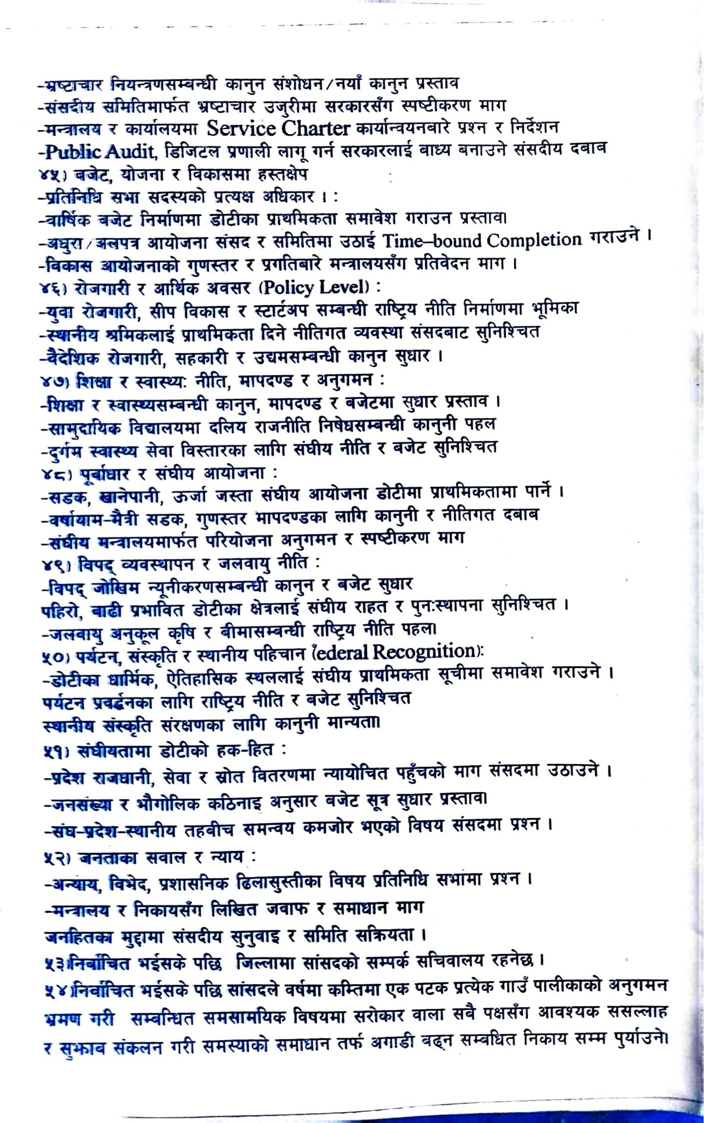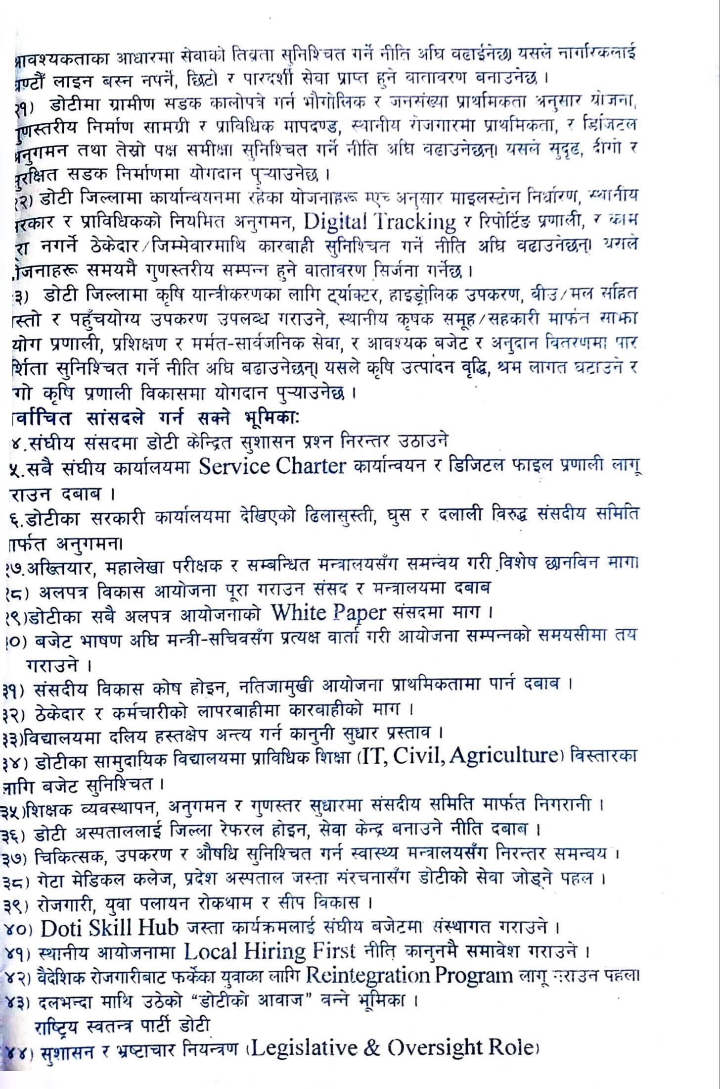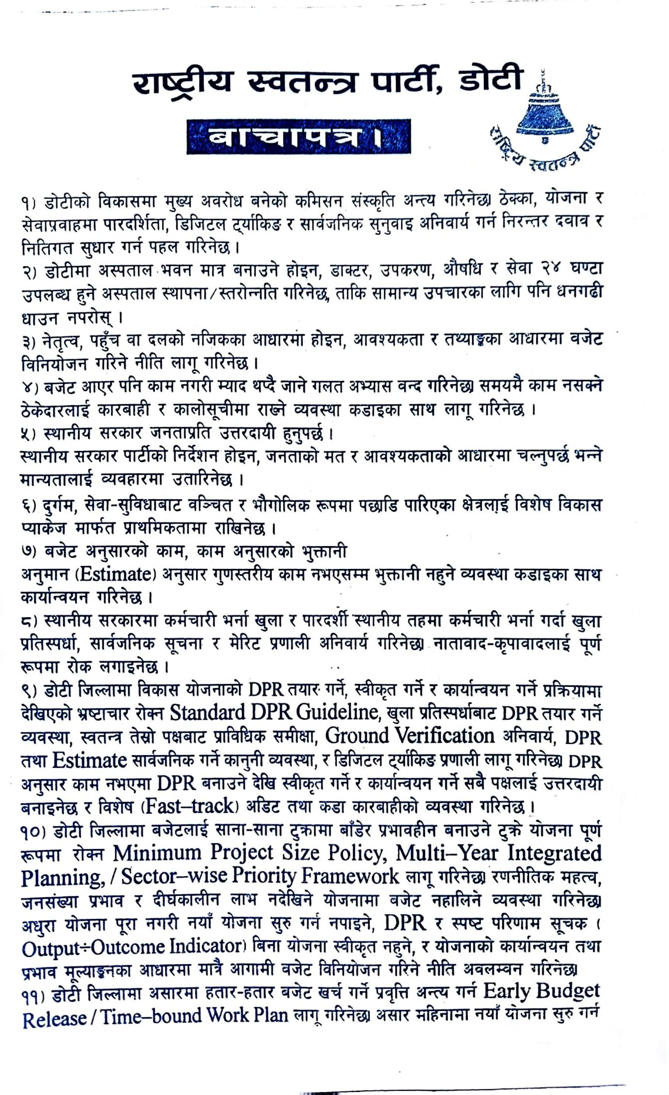 पार्टीका अनुसार डोटी जिल्लाको समग्र विकास, रोजगारी सिर्जना, शिक्षा र स्वास्थ्य सेवाको गुणस्तर सुधार, भ्रष्टाचार नियन्त्रण तथा स्थानीय स्रोत–साधनको प्रभावकारी उपयोग बाचापत्रका मुख्य एजेन्डा रहेका छन्। साथै युवाको सहभागिता बढाउने, सेवाग्राहीमैत्री प्रशासन विकास गर्ने र विकास निर्माणमा राजनीतिक हस्तक्षेप अन्त्य गर्ने प्रतिबद्धता व्यक्त गरिएको छ।