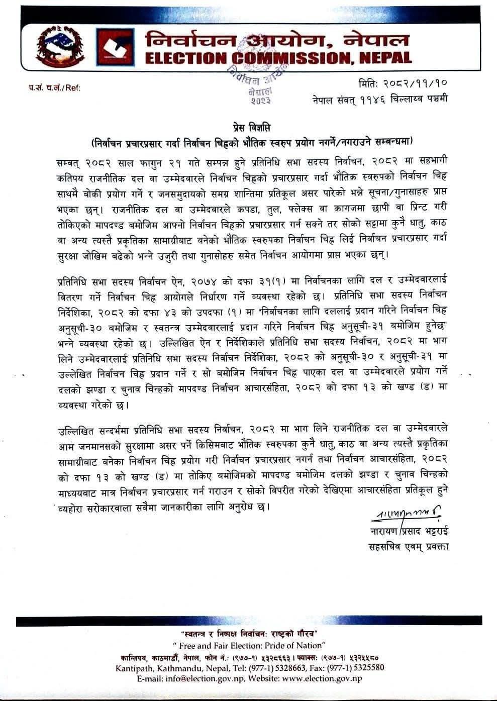 आयोगका प्रवक्ता नारायणप्रसाद भट्टराईले आइतबार विज्ञप्ति जारी गर्दै प्रचारप्रसार गर्दा धातु, काठ वा अन्य सामग्रीबाट बनेका भौतिक चुनाव चिह्न बोकी हिँड्ने तथा प्रदर्शन गर्ने कार्य नगर्न आग्रह गरेका हुन्।