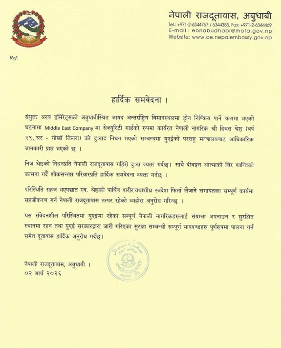 अबुधाबीस्थित नेपाली राजदूतावासले मृतक श्रेष्ठको पार्थिव शरीर स्वदेश फर्काउन आवश्यक सहजीकरण गरिने जनाएको छ।