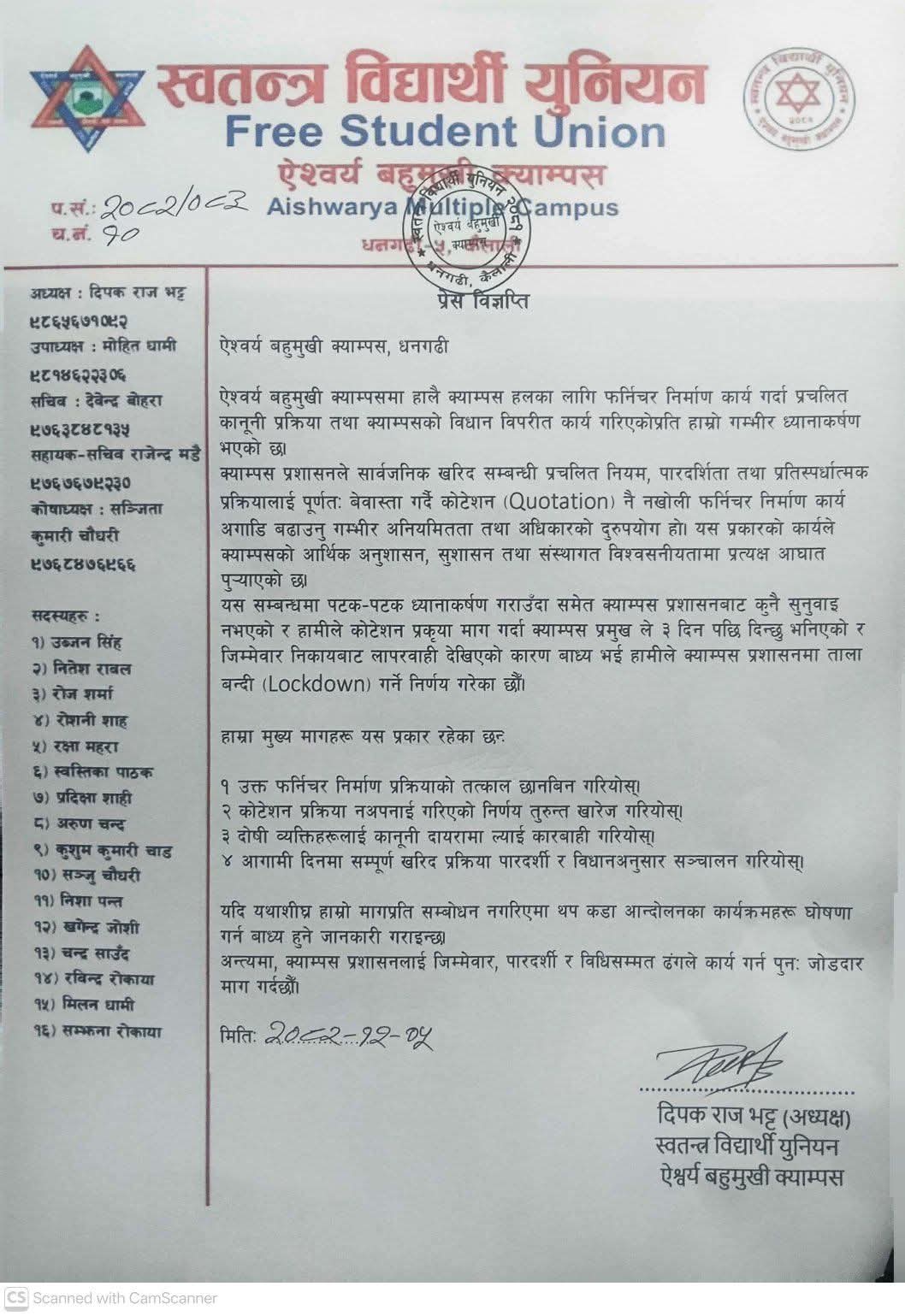 स्ववियु अध्यक्ष दिपक राज भट्टद्वारा जारी विज्ञप्तिअनुसार क्याम्पसकाे हलका लागि फर्निचर खरिद गर्दा प्रतिस्पर्धात्मक प्रक्रिया अपनाइएको छैन। कोटेशनसमेत नखोली काम अघि बढाइएको आरोप लगाउँदै यसले आर्थिक पारदर्शिता र संस्थाको विश्वसनीयतामाथि गम्भीर प्रश्न उठाएको उनले बताए।