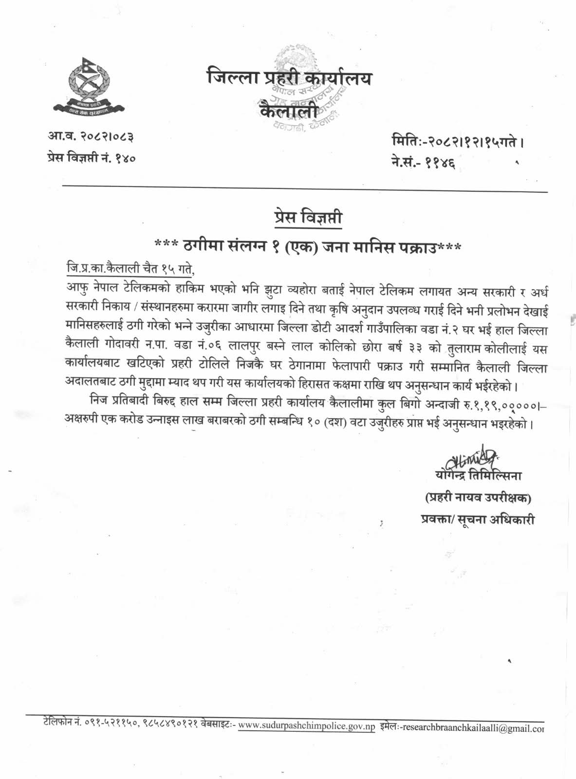 सरकारी जागिर लगाउने भन्दै सवा एक करोड ठगी गर्ने डोटीका कोली पक्राउ