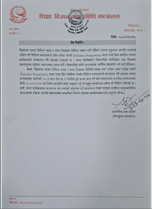 काठमाडौं: शिक्षा, विज्ञान तथा प्रविधि मन्त्रालय ले देशभर सञ्चालन हुँदै आएका प्रवेश तयारी कक्षा र ब्रिज कोर्सहरूमा प्रतिबन्ध लगाउने निर्णय गरेको छ।