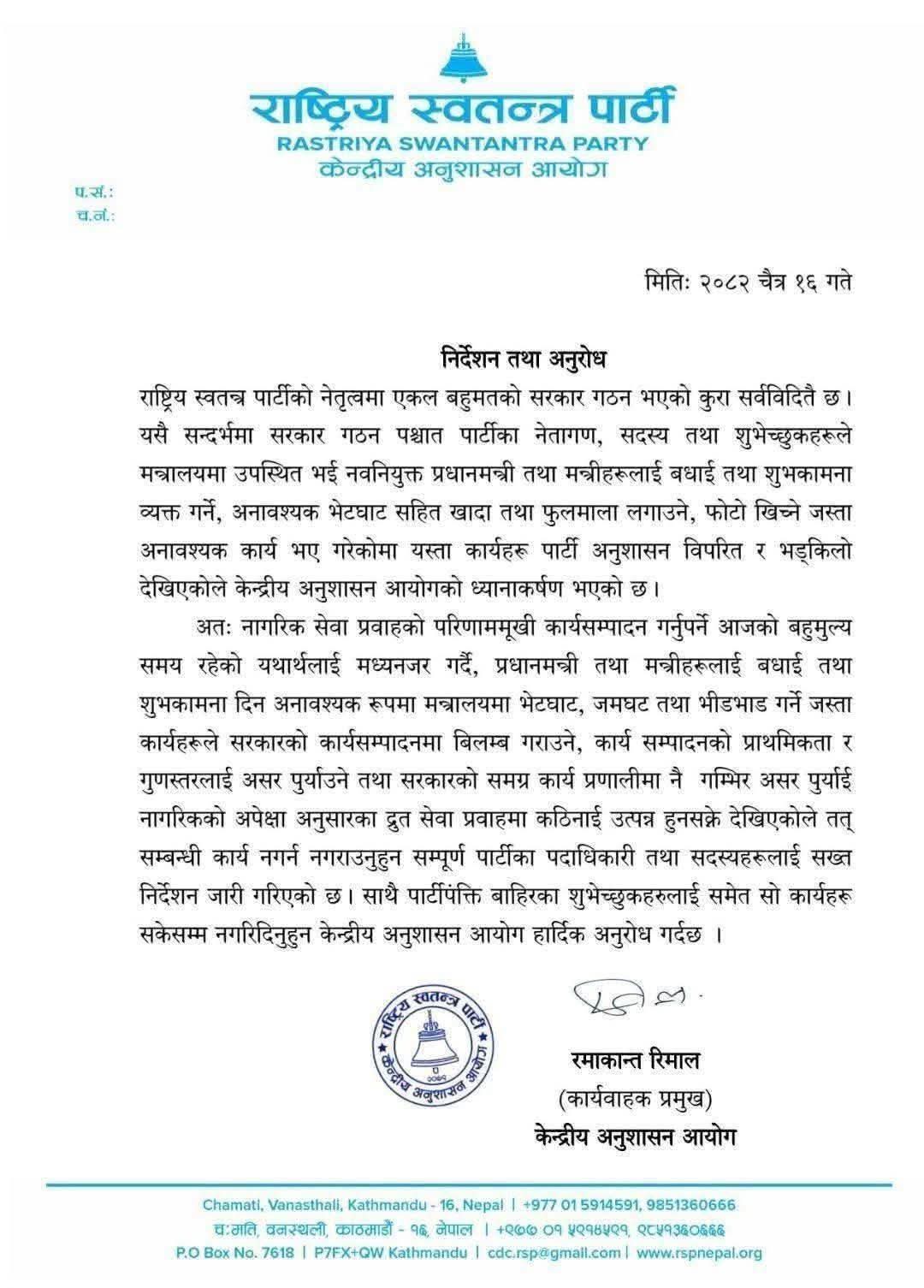 Kathmandu: The National Independent Party (RSP) has instructed its leaders, cadres and well-wishers to refrain from unnecessarily crowding ministries following the formation of the new government.