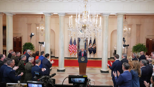 ह्वाइट हाउसबाट बुधबार साँझ सम्बोधन गर्दै ट्रम्पले संयुक्त राज्य अमेरिका आफ्नो लक्ष्य हासिल गर्ने चरणमा पुगेको बताए, तर युद्ध कसरी र कहिले टुङ्गिन्छ भन्नेबारे स्पष्ट खाका प्रस्तुत गरेनन्। उनले ‘काम छिट्टै पूरा गरिने’ दाबी दोहोर्याउँदै अमेरिकी आक्रमण अझ तीव्र हुने सङ्केत गरे।