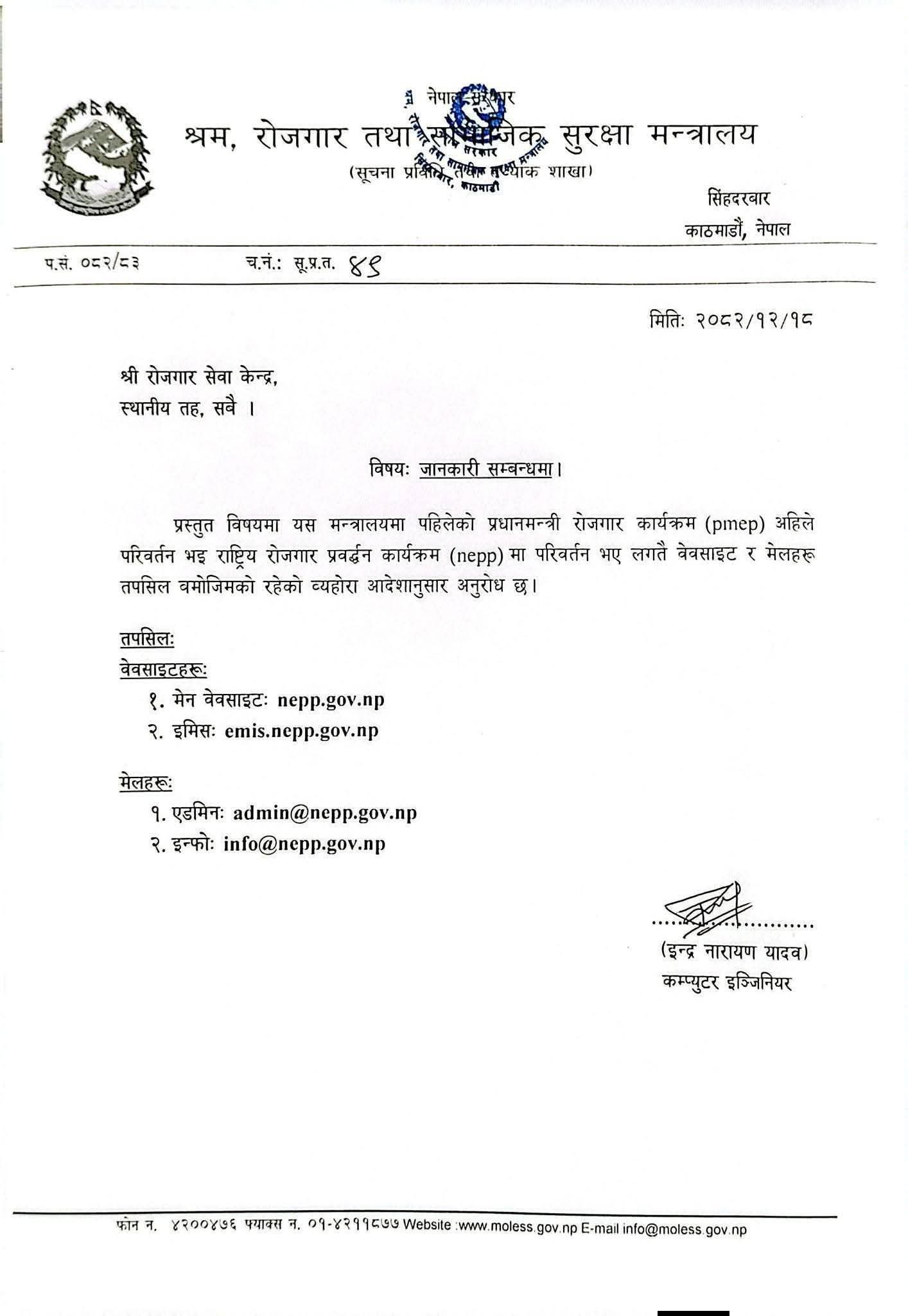अब कार्यक्रमको मुख्य वेबसाइट nepp.gov.np रहनेछ भने रोजगार व्यवस्थापन सूचना प्रणाली (EMIS) का लागि emis.nepp.gov.np प्रयोग गरिनेछ।