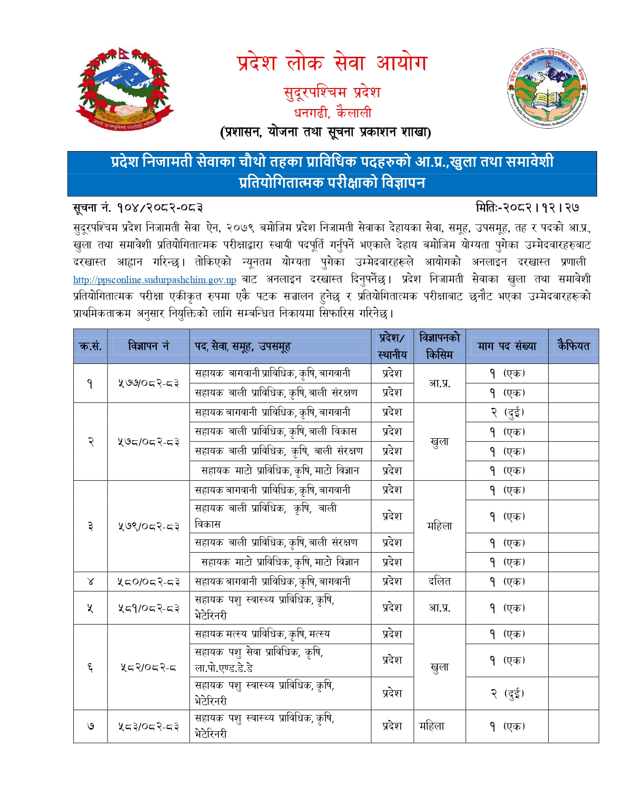 प्रदेश निजामती सेवाको चौथो तहका अप्राविधिक पदमा आन्तरिक, खुला तथा समावेशी प्रतियोगात्मक परीक्षाको विज्ञापन खोलिएको हो । उक्त शीषर्कमा ४४ जना कर्मचारी मागिएको छ ।