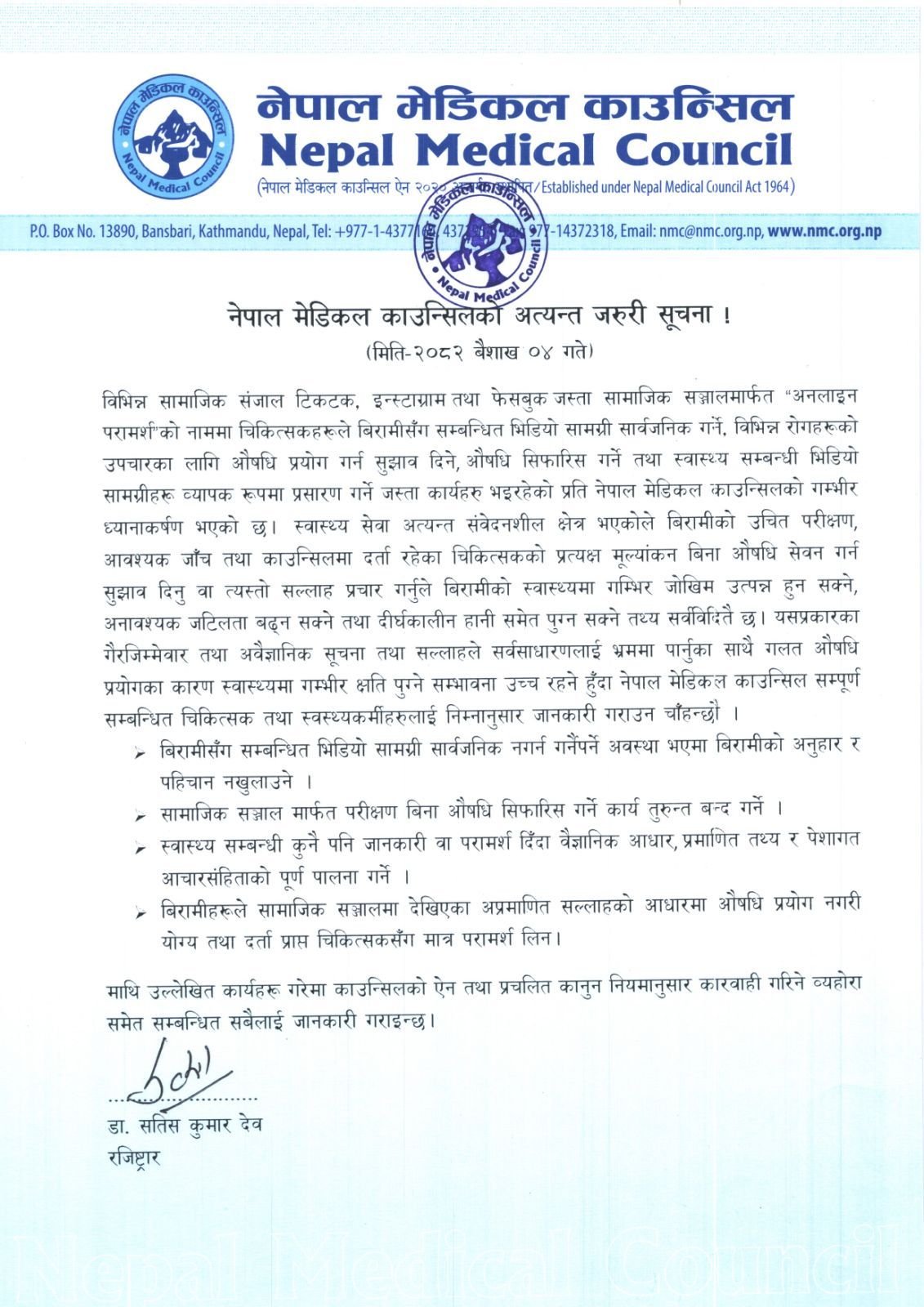 काउन्सिलले सूचना निकालेर फेसबुक, टिकटक, इन्स्टाग्रामलगायत सामाजिक सञ्जालमा ‘अनलाइन परामर्श’ को नाममा डाक्टरहरूले उपचार विधि, औषधि प्रयोग र स्वास्थ्यसम्बन्धी सामग्री सार्वजनिक गर्ने क्रम बढेको भन्दै त्यसो नगर्न भनेको छ । यस्ता सामग्रीका कारण बिरामीले आफैं औषधि प्रयोग गर्ने, गलत उपचार अपनाउने तथा स्वास्थ्यमा गम्भीर जोखिम उत्पन्न हुन सक्ने भन्दै काउन्सिलले ध्यानाकर्षण गराएको हो ।