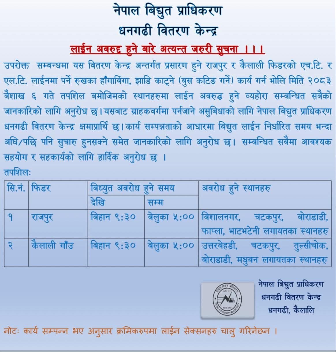 धनगढी: नेपाल विद्युत प्राधिकरण अन्तर्गत धनगढी वितरण केन्द्र ले लाइन अवरुद्ध हुनेबारे अत्यन्त जरुरी सूचना जारी गरेको छ। प्राधिकरणका अनुसार राजपुर र कैलाली गाउँ फिडरअन्तर्गतका एचटी तथा एलटी लाइनमा रहेका हाँगाविङ्गा तथा झाडी कटान (बस कटिङ) कार्य गर्न लागिएकोले विद्युत् सेवा अस्थायी रूपमा अवरुद्ध हुने भएको हो।