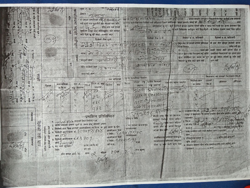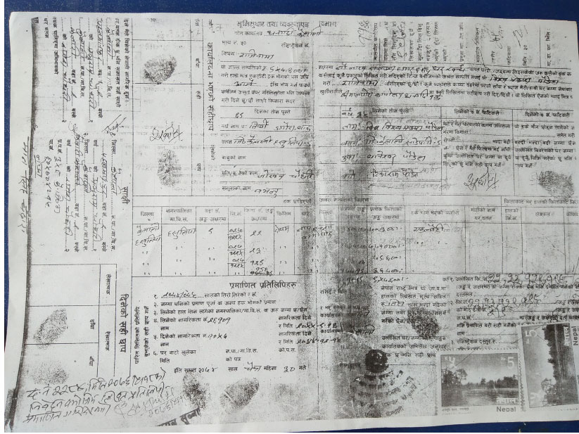 कैलालीको साविकको हसुलिया गाविस वडा नम्बर ९ की तिर्थी डगौरा थारुको झण्डै साढे १३ कठ्ठा जग्गा २०७४ चैतमा जिल्ला सहकारी संघका अध्यक्ष समेत रहेका साविकको साडेपानी गाविस ९ का विश्वप्रकाश पौडेलको नाममा बिक्रि भएको छ। दिनेश खबरलाई प्राप्त भूमी सुधार तथा मालपोत कार्यालय धनगढीबाट प्रमाणित कागजपत्रलाई हेर्दा विश्वप्रकाशले तिर्थीको नाममा रहेको कित्ता नम्बर २२, ३३, एक सय २९ र एक सय ९६ को झण्डै साढे १३ कठ्ठा नौ लाख ५७ हजारमा आफ्नो नाममा पास गरेका छन्।