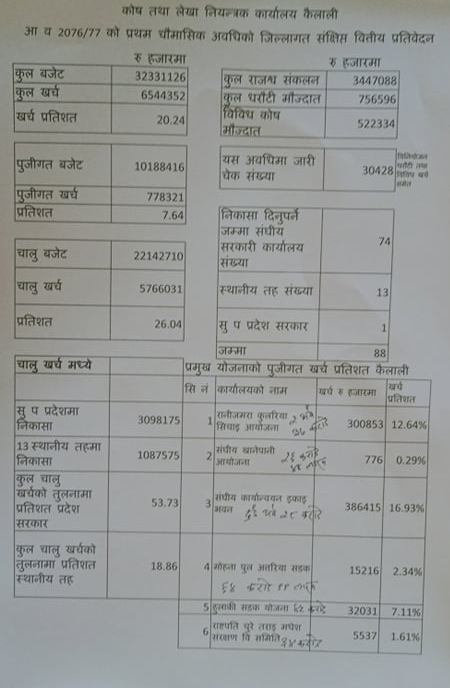 जिल्लामा पहिलो चौमासिकमा ७ दशमलव ६४ प्रतिशत मात्र पुँजीगत अर्थात विकास तर्फको बजेट खर्च भएको छ। चालु आर्थिक वर्षका लागि १० अर्ब १८ करोड विकास बजेट रहेकोमा पहिलो चौमासिकमा ७ दशमल ६४ प्रतिशत अर्थात ७७ करोड बजेट खर्च भएको कोष तथा लेखा नियन्त्रक कार्यालयका सूचना अधिकारी मदनराज पाण्डेले बताए। उनका अनुसार चालु आर्थिक वर्ष २०७६/०७७ मा कैलालीका ६ ठुला विकासे आयोजनामा सबैभन्दा कम शुन्य दशमलव २९ प्रतिशत खर्च संघीय खानेपानी आयोजनाको छ।