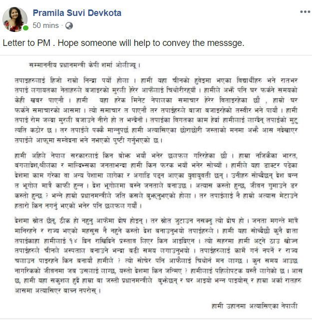 वुहानमा रहेकी नयाँ पत्रिकाकी चिन संवाददाता प्रमिला सुवेदी देवकोटाले सेयर गरेको पत्रमा आफूहरु कोठामा थुनिएर बसेको यतिका दिन बितिसक्दा पनि आफ्नो देशको सरकारले उद्धार नगरेको बताइएको छ।