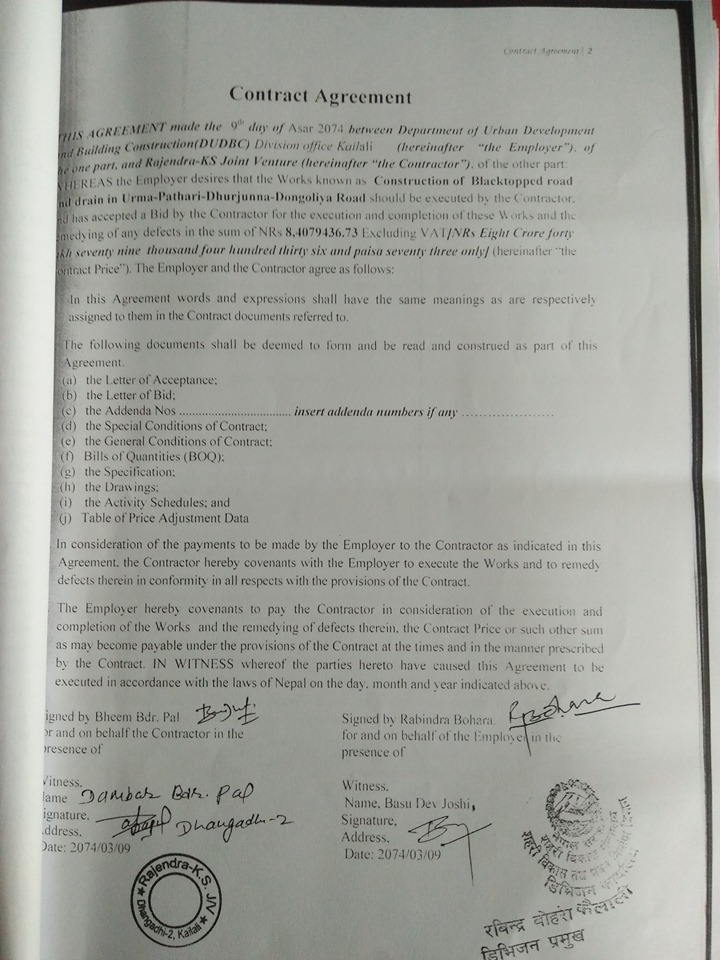 जसको ठेक्का आह्वान २०७३ साल फागुन १३ मा भएको थियो। जेभीले गत असारमा सडकको काम सम्पन्न गरेको थियो। तर निर्माण व्यवसायीले भने सो सडकमा मापदण्ड अनुसार नै काम भएको दावी गरेका छन्। केएस जेभीबाट कामको जिम्मा लिएका धनगढीका ललित बोहराले सडकमा मापदण्ड मिचेर काम भएको आरोप गलत भएको दावी गरे। उनले इन्जिनीयरले गरेको डिजाईन स्टमेटमै टिकेर कालोपत्रे गरिएको जिकिर गरे।