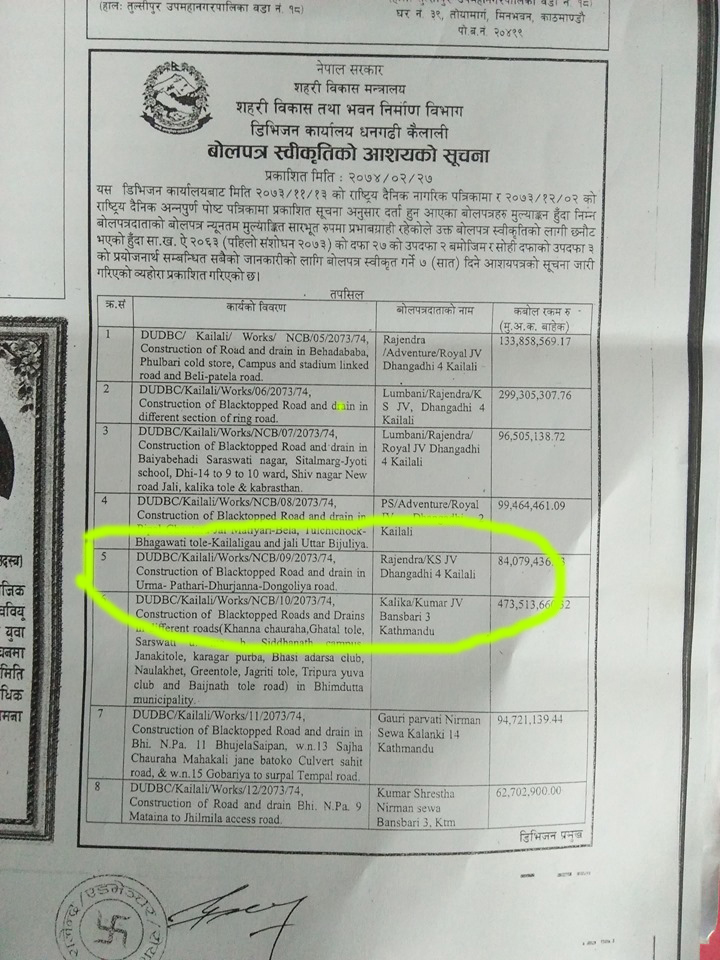 संघिय आयोजना कार्यान्वयन ईकाइ धनगढीले निर्माण व्यवसायी केएस जेभीसंग ठेक्का सम्झौता गरी कार्यान्वयन गरेको सडकमा मापदण्ड अनुसार काम नभई भुक्तानी दिईएको छ। मापदण्ड अनुसार २० मिलिमिटरको कालोपत्रे बन्नुपर्ने सडकमा कतै ५ त कतै १० देखि १६ मिलिमिटर मात्रै हालिएको गुनासो गरिएको छ।
