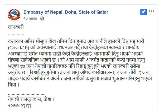 कतारका विभिन्न जेलमा रहेका १७ जना नेपालीहरुले आममाफी पाएका छन्। कोरोना भाइरसको महामारी फैलिएकाले कैदीहरुको स्वास्थ्य र मानवीय अवस्थालाई ध्यानमा राखेर कतारका राजाले केही कैदीहरुलाई आममाफी दिने निर्णय गरेका छन्।