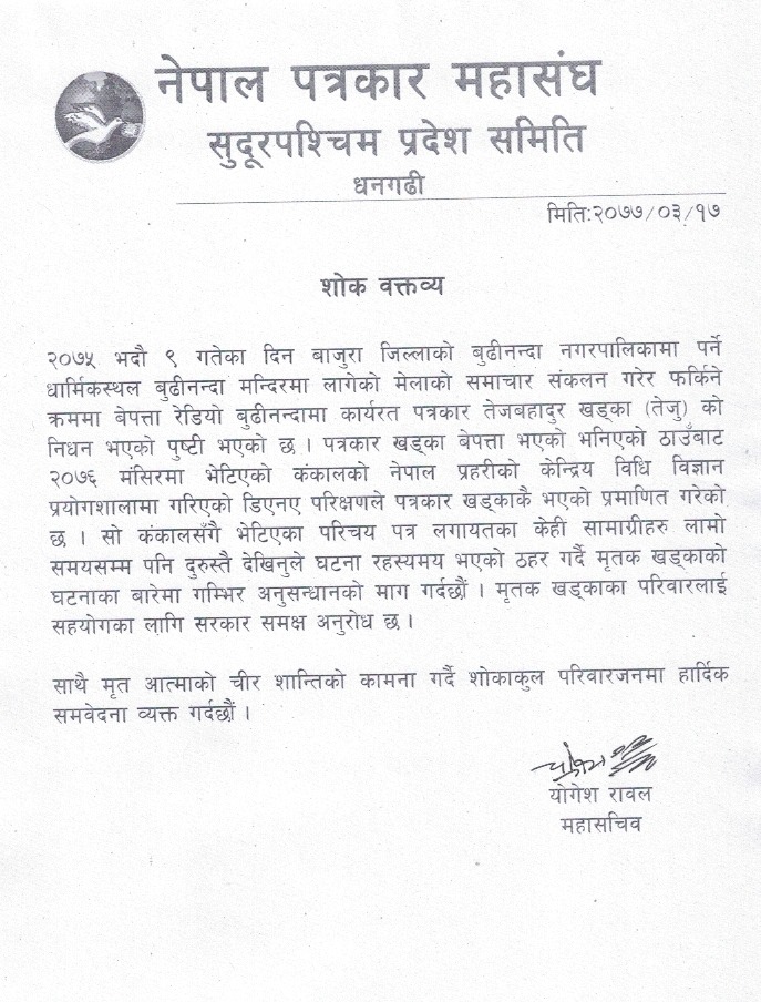 The Federation of Nepali Journalists (FNJ), Far-West, has demanded an investigation regarding the death of journalist Tej Bahadur Khadka from Doti. The federation has also demanded help for the deceased’s family. Khadka was reported missing in August 2075 after attending a fair in Budhinanda and Nepal Police found his skeleton in December last year. A statement issued by FNCCI General Secretary Yogesh Rawal demands an investigation as the cause for his demise is ambiguous. “The cause for his demise is a mystery as some of the materials, including his identity card, were found with the skeleton and none of it was damaged. We demand a scrutinized investigation of the incident,” he mentioned in the statement.