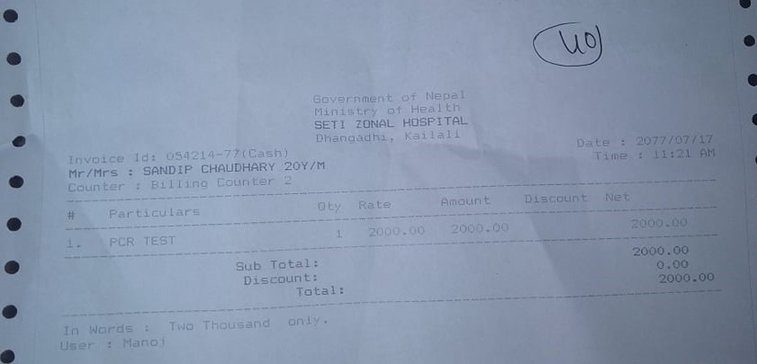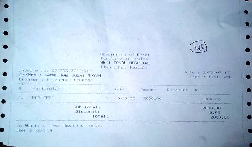 ‘कोरोना परीक्षणको शुल्क नलाग्ने सुनेको थिए,’ उनले भने ‘स्वाब संकलनका लागि धनगढी पुगेपछि भने २ हजार तिर्न बाध्य भए ।’