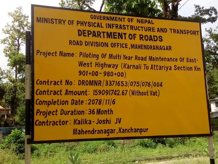 कैलालीको अत्तरियादेखि चिसापानीसम्मको ७९ किलोमिटर सडक मर्मतका लागि कालिका–जोशी जेभी र सडक डिभिजन कार्यालय महेन्द्रनगरबीच १५ करोड ९० लाख ९१ हजारमा ठेक्का सम्झौता भएको छ ।