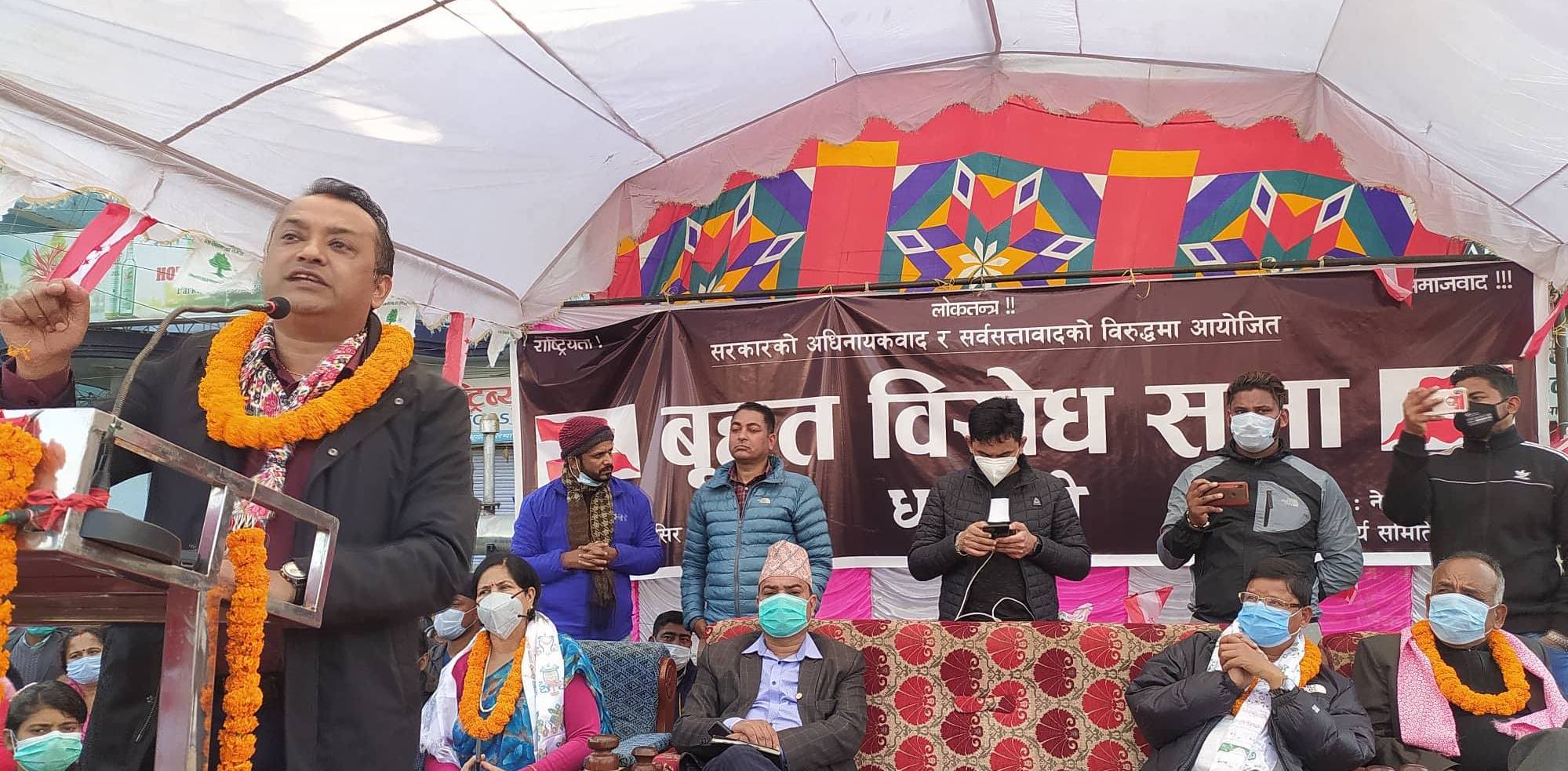 उनले पनि विना मास्क हाकाहाकी सरकार विरोधी भाषण गरे जसको समर्थनमा अन्यत्रजस्तै कार्यकर्ताले ताली पड्काए ।