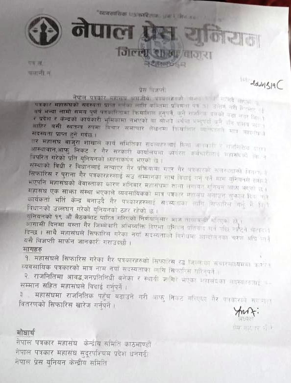 महासंघले गैर पत्रकारको नामावली खारेज नगरेमा थप चरणबद्ध आन्दोलन गर्ने युनियनद्वारा जारी विज्ञप्तीमा भनिएको छ।