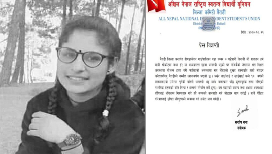 धनगढीः नेकपा ओली समूह निकट अनेरास्ववीयू बैतडीले दोगडाकेदार गाउँपालिका–७ की १७ वर्षीया किशोरी भागरथी भट्टको बलात्कारपछि हत्या गरिएको जनाएको छ।