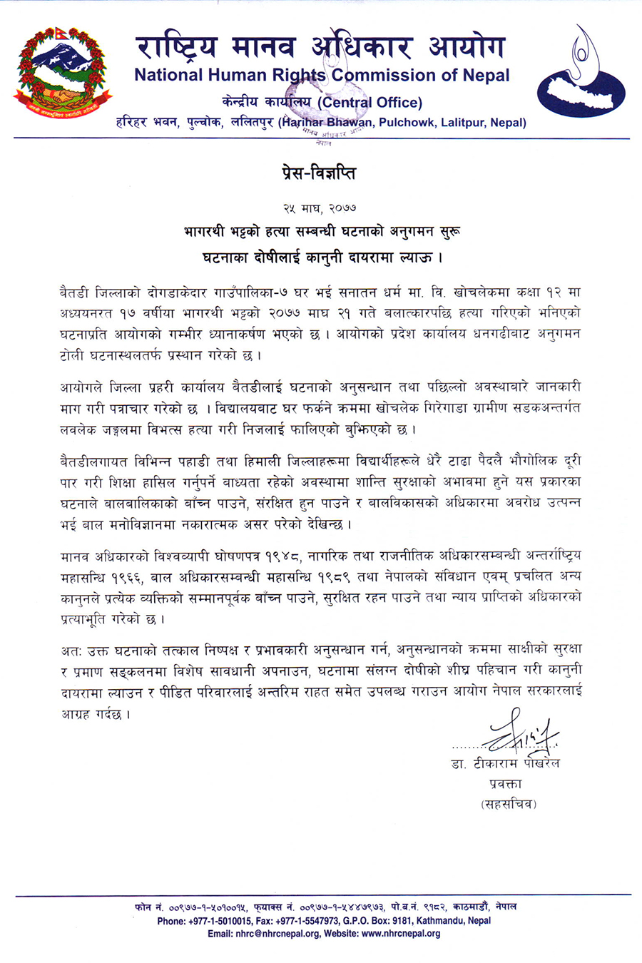 धनगढी: बैतडीमा बिहीबार मृत अवस्थामा फेला परेकी भागरथी भट्टको हत्यामा संलग्न दोषीलाई कानुनी दायरामा ल्याई कारबाही गर्न राष्ट्रिय मानव अधिकार आयोगले सरकारसँग माग गरेको छ।