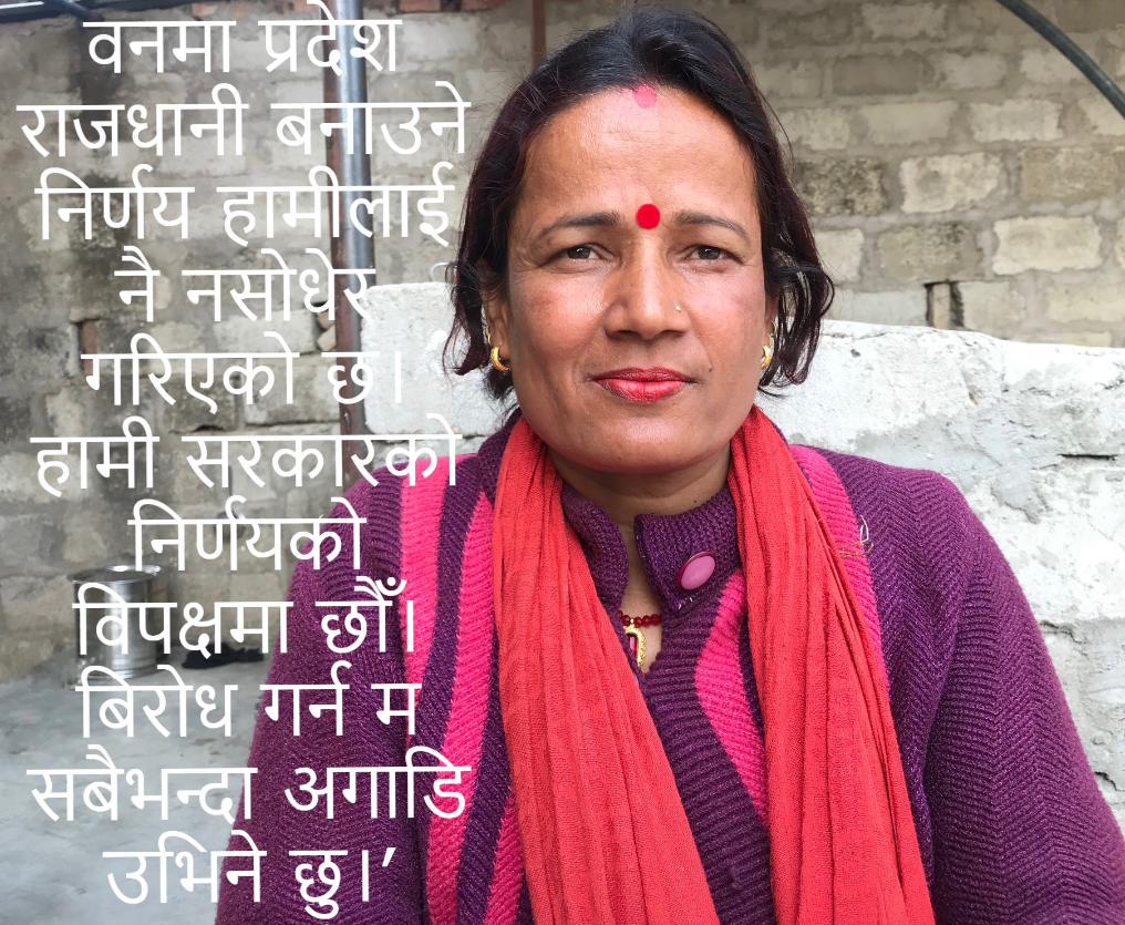 उनले दिनेशखबरसँग भनिन, ‘हामीले दुःख गरेर जोगाएको वनमा प्रदेश राजधानी बनाउने निर्णय हामीलाई नै नसोधेर गरिएको छ। जुन कुराको विरोध सबैले गरेका छन्। कम्तिमा एक पटक त सोध्नु पर्थ्यो। हामी सरकारको निर्णयको विपक्षमा छौँ। बिरोध गर्न म सबैभन्दा अगाडि उभिने छु।’