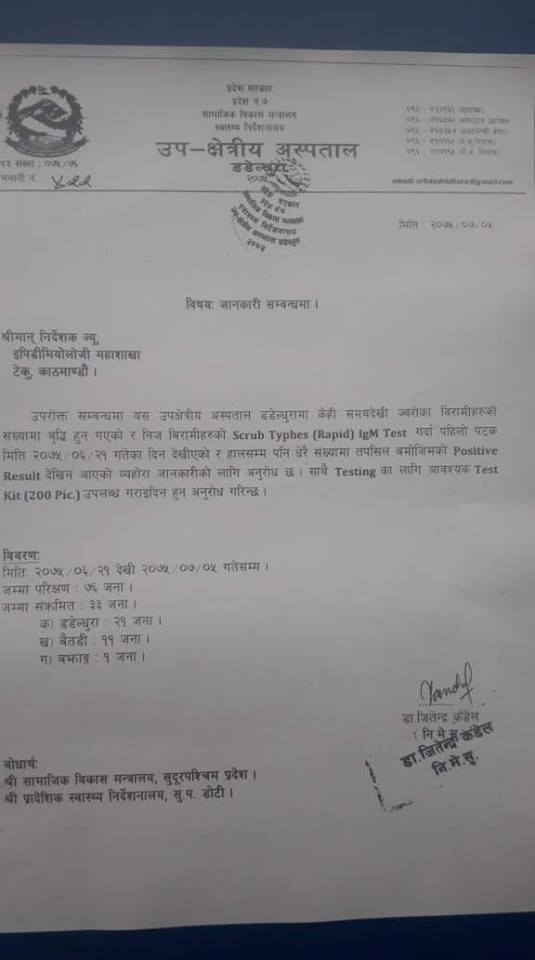 ती विरामीमा २१ जना डडेल्धुराकै रहेका छन भने ११ जना वैतडीका र वझाङका एक जना रहेका छन् । धनगढीको सेती अञ्चल अस्पतालमा पनि यो बर्ष ५० जना स्क्रब टाईफसका विरामी देखिएकोमा डडेल्धुराकी २२ वर्षीया सरस्वती भट्टको मृत्यु भईसकेको छ । सुदुरपश्चिमका विभिन्न जिल्लाहरुमा यो रोगको प्रकोप फैलिदै गएको सुदुरपश्चिम स्वास्थ्य निर्देशनालयका निर्देशक डाक्टर गुणराज अवस्थीले बताए ।